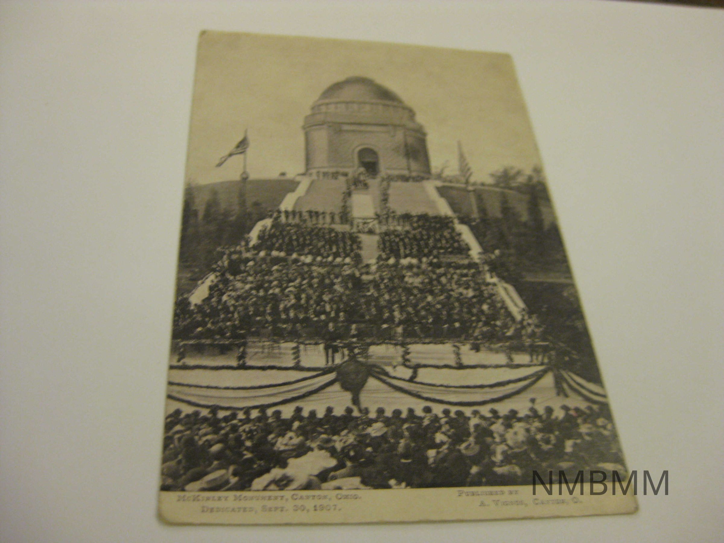the McKinley Memorial dedication in Canton, Ohio. Published by A. Vignos, Canton, Ohio. There is a crowd on the steps, below the steps, and in front of the building. Stage is decorated. Back side: Advertisements for postcards, novelty knives from Novelty Cutlery Co., Canton, O. and candy making at home by the Home Candy Makers, 200 Barr Street Canton, Ohio.Collection