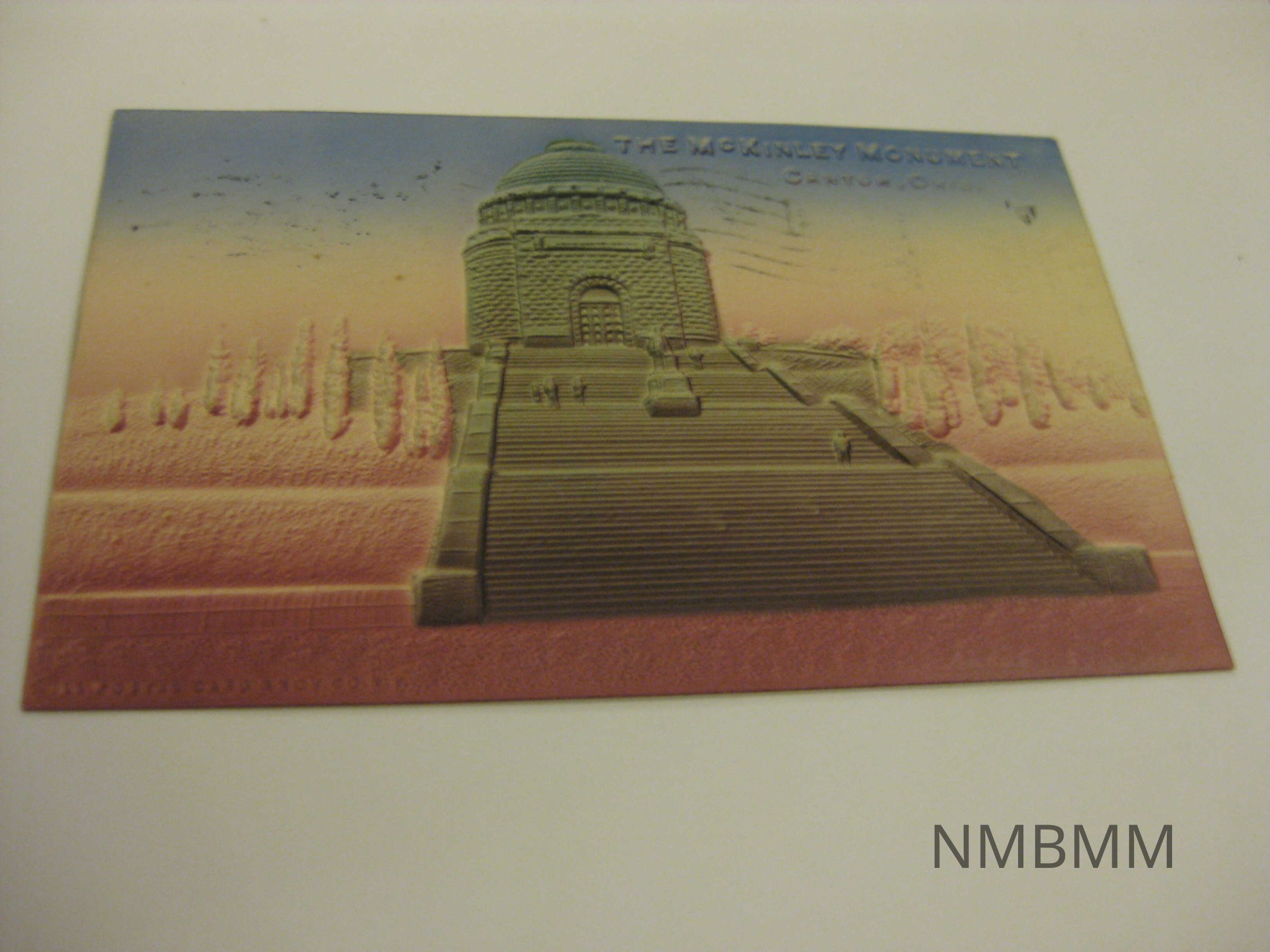 This item is a horizontal pink, blue, and white postcard with a raised image of the McKinley Monument Canton, Ohio. There are a few people on the steps and trees line both sides of the monument. Back side: green one cent Benjamin Franklin stamp, has a split back, one side for address one side for correspondence, and it also had an eagle with shield in the upper left corner. Addressed to Miss Lillah [last name illegible] of Massillon Rout #5. Postmark Massillon Nov 9, 1907.