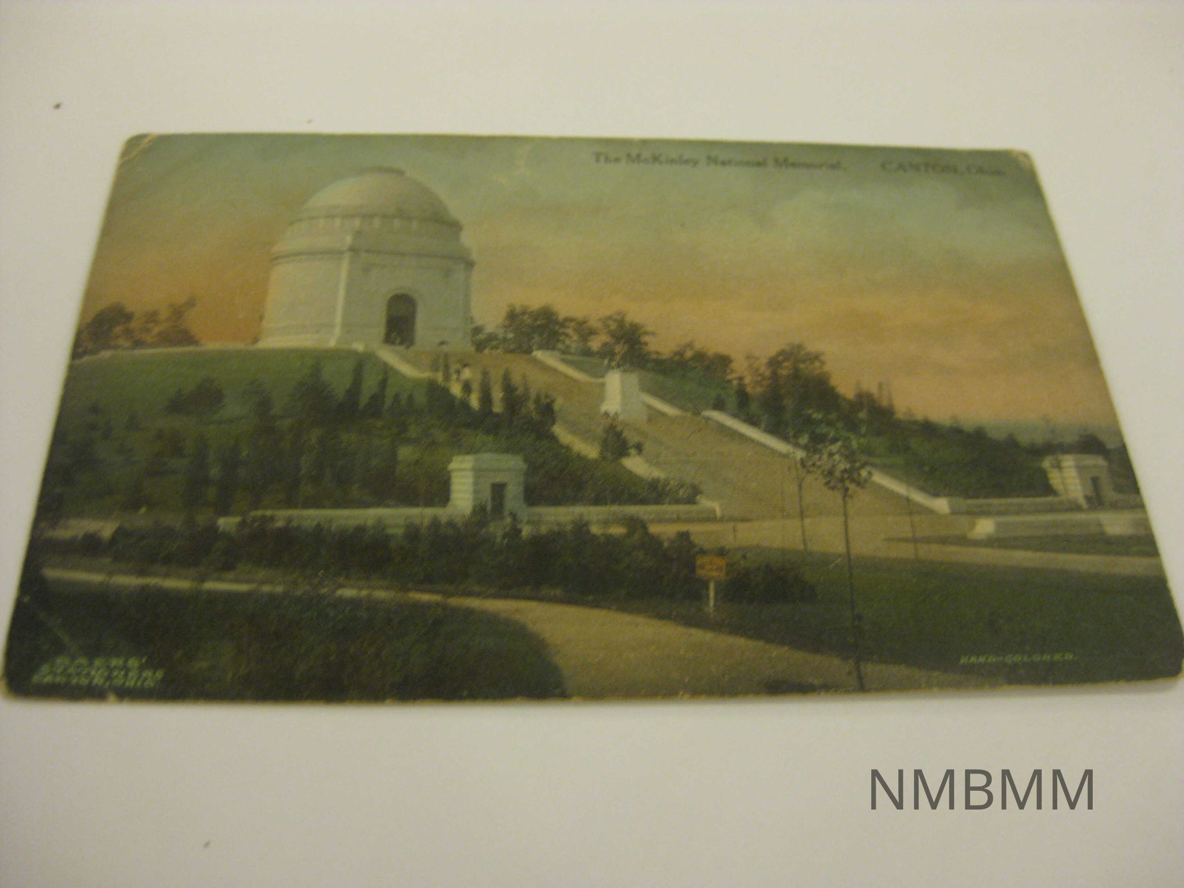 the McKinley National Memorial in Canton, Ohio. Memorial is red surrrounded by trees and clouds. Baers' Stationers Canton, Ohio. Split back: Date written 10-9-65, Required one cent stamp for mailing, Written in pencil: Lydia Belle from Papa Nov 28-1909, The Albertype Co. Brooklyn, N.Y.Collection
