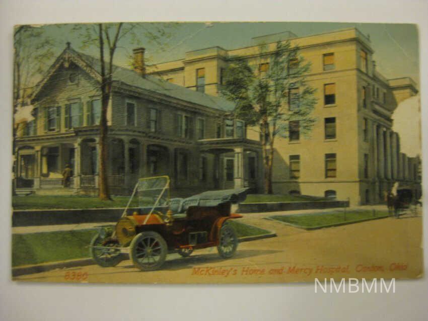 This item is a postcard depicting President McKinley's house in Canton, Ohio. In the foreground is a car, and in the background is Mercy Hospital. Published by The Acmegraph Co. Chicago. The postcard, to Mary Bloomer, reads "Dear Mary, Received your letter the day we moved. It was mislaid or lost. Cannot send your books untill I hear from you again all well at present. Mrs. Hagy 623 Union Ave."Collection