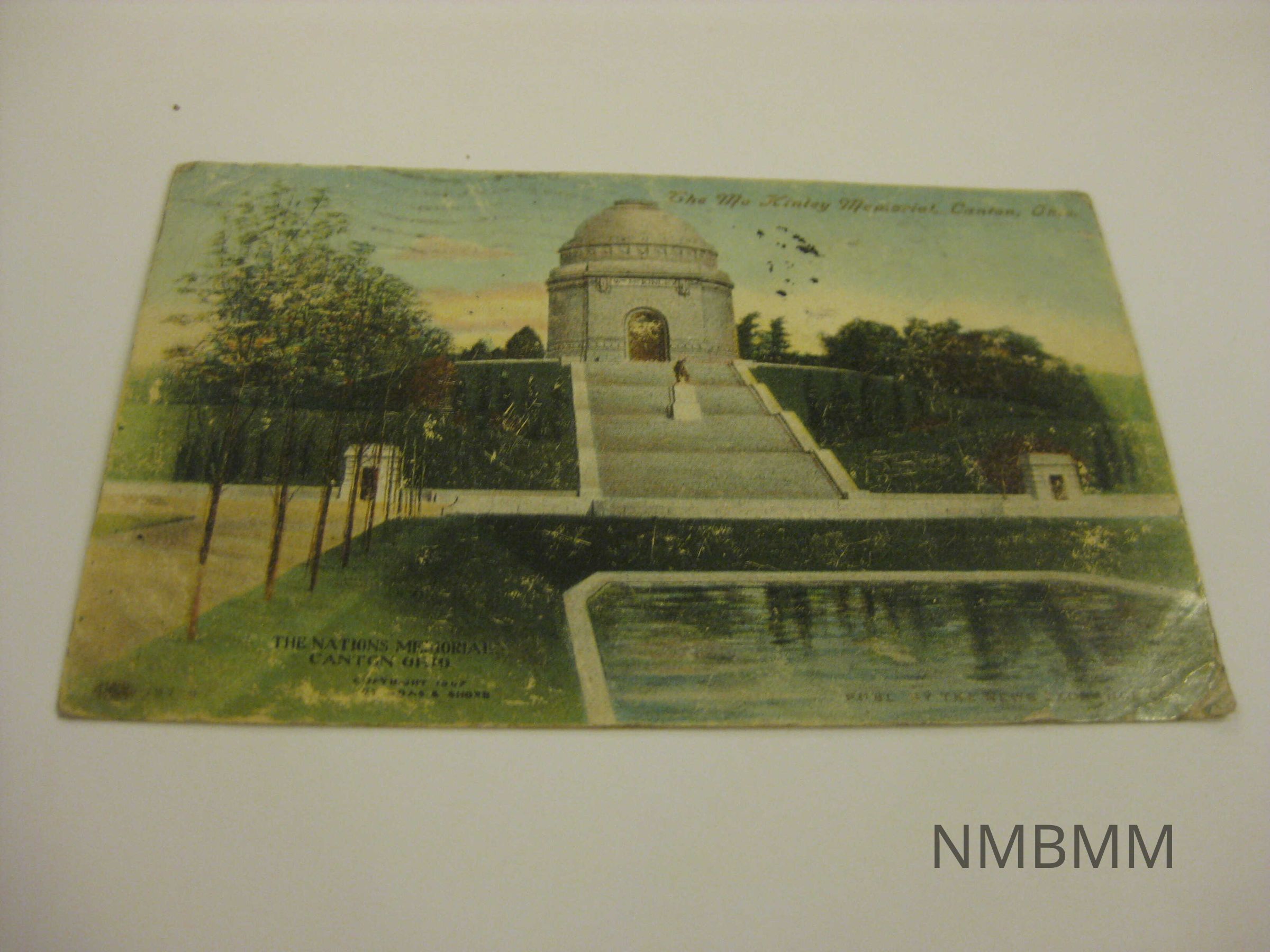 the McKinley Memorial in Canton, Ohio. Memorial is red surrrounded by trees and clouds. Split back: green one cent Benjamin Franklin stamp, Addressed to Miss Nettie Burton #704 Amelia St. Fredricksburg, Va. Text Summary: Discusses a mutual friend Mary White saying that Nettie wanted a young man to exchange post cards with so the writer thought he would write to her. Signed Jack Chapman 322 So. Cherry Street. Postmark Canton Ohio Oct 18 1907.Collection