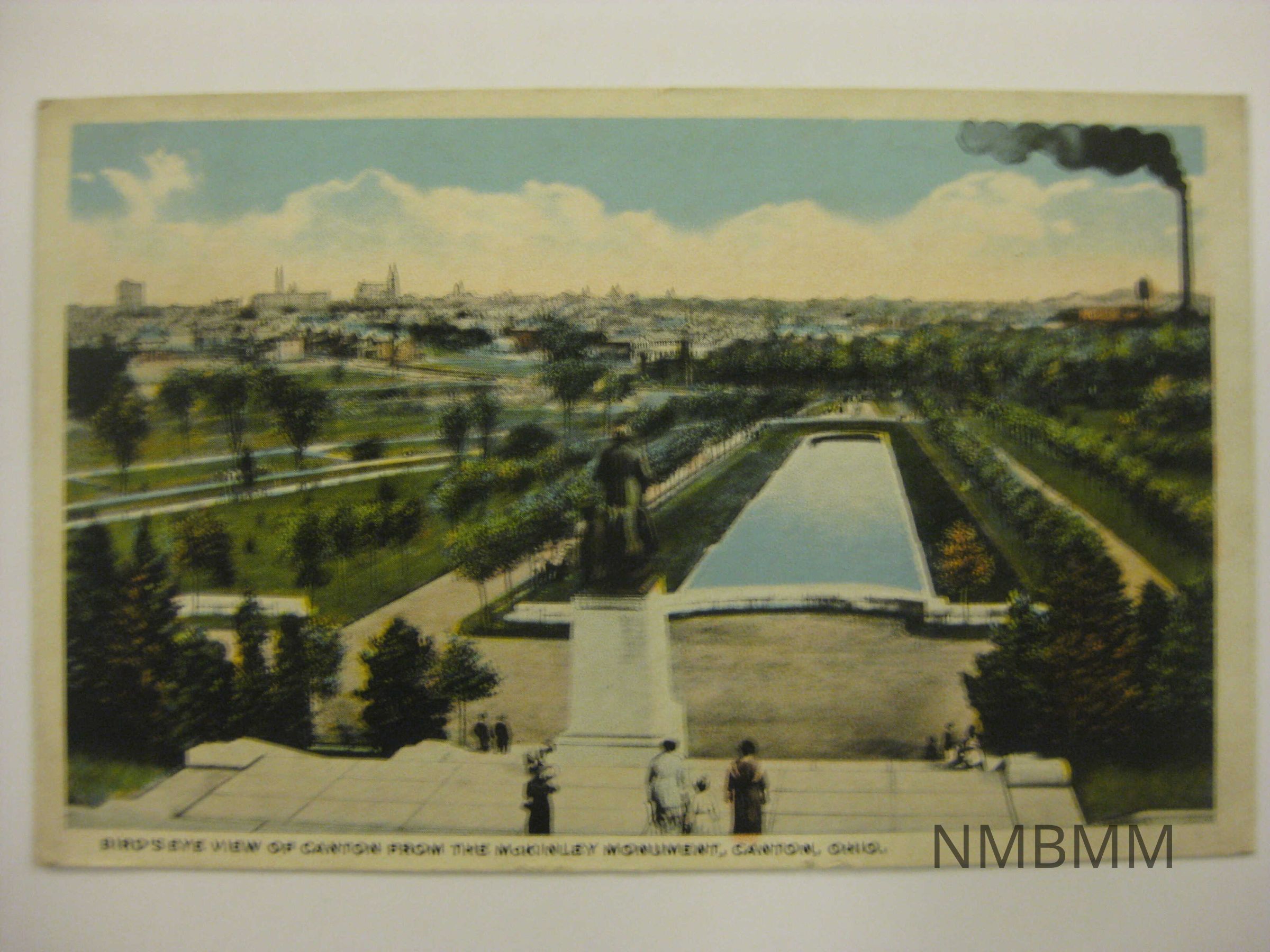 This item is a postcard depicting the tomb and memorial dedicated to President McKinley in Canton, Ohio, with the statue in the foreground, and a relfecting pool, smoke stacks, and Canton in the background. Published by the Rubber City Distributing Company, Inc., Akron, Ohio.Collection