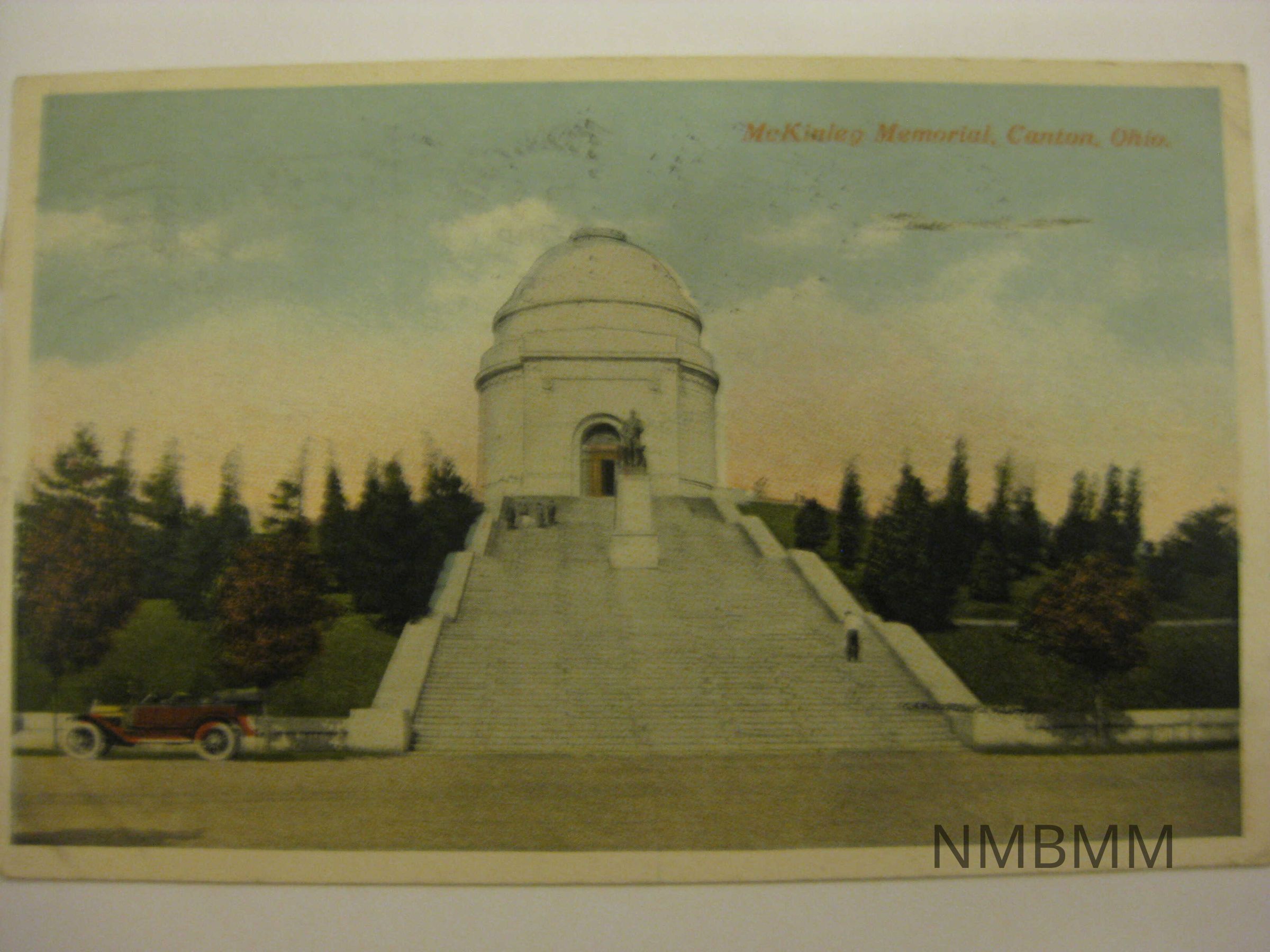 This item is a postcard depicting the tomb and memorial dedicated to President McKinley in Canton, Ohio, with the memorial, stairs and statue in the background, and a car in the foreground. Published by Ralph Young, Canton, Ohio. The writing on the back reads " Down for a game here. Received your letter yesterday and will write the first change I get regarding Lou." The letter is addressed to Miss Alice Merkt.Collection