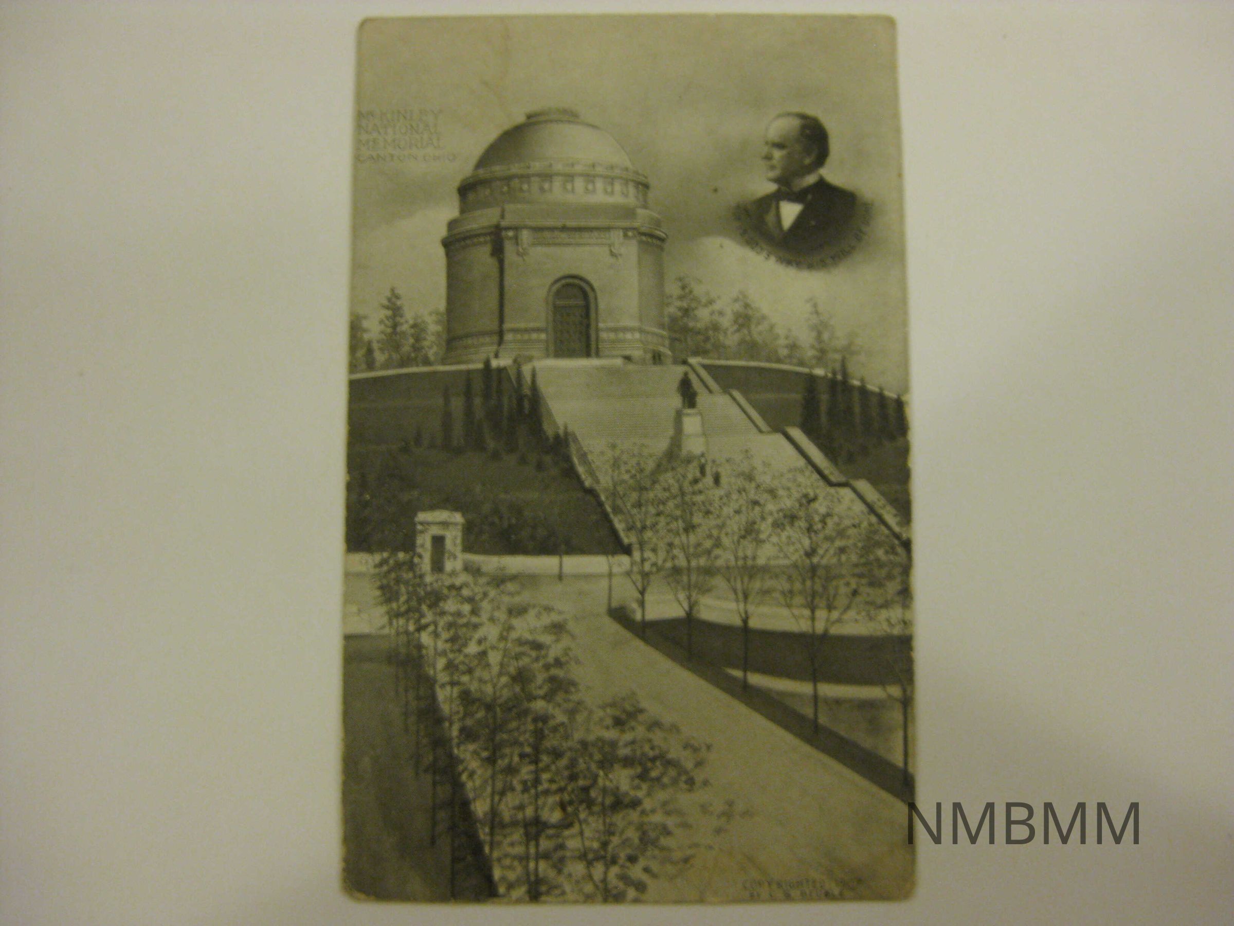 This item is a postcard depicting a drawing of the tomb and memorial dedicated to President McKinley in Canton, Ohio, with the memorial, stairs and statue in the background, and a portrait of President McKinley in the upper right hand corner. Published by C. G. Deuble, Canton, Ohio.Collection