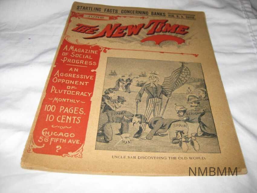 This magazine is entitled "The New Time." It was published in June 1898. The cover is tan with black and red print and features a policitcal cartoon on the front of Uncle Sam being bowed to by personified countries. The caption reads "Uncle Sam discovering the Old World."