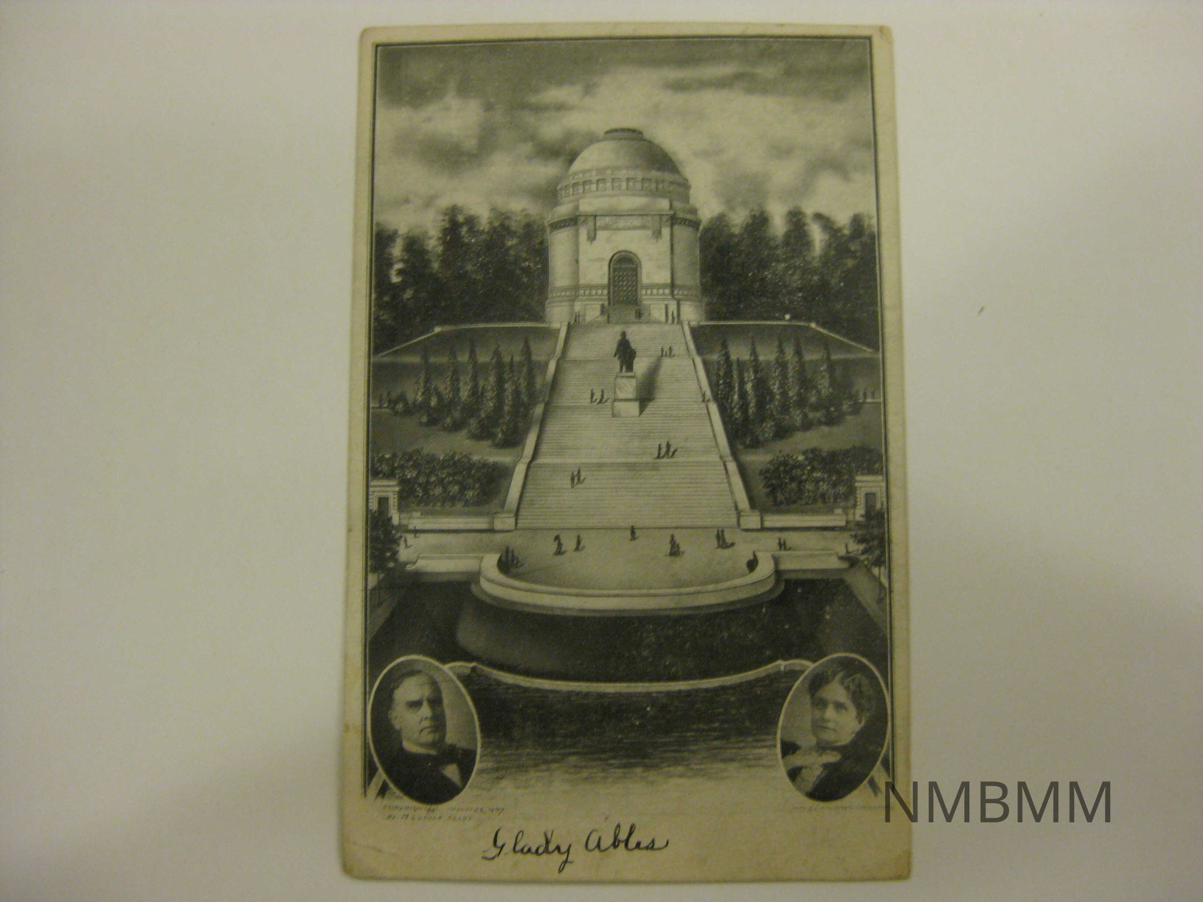 This item is a postcard depicting a drawing of the tomb and memorial dedicated to President McKinley in Canton, Ohio, with the memorial, stairs and statue in the background, and the reflecting pool in the foreground, and portraits of President McKinley and Ida McKinley. The back reads, "Compliments of Gladys Ables", and it is addressed to Miss Isolena Cunningham.Collection
