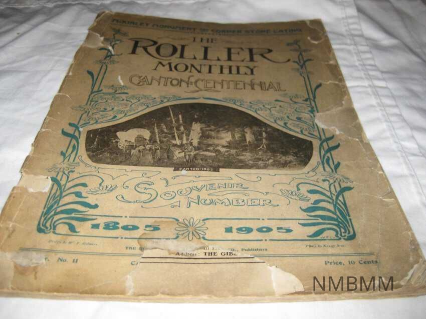 This magazine is entitled "The Roller Monthly". It was released for the Canton Centennial and the corner stone laying of the McKinley Monument. The cover has black text and green designs around a black and white picture of Canton in 1815.