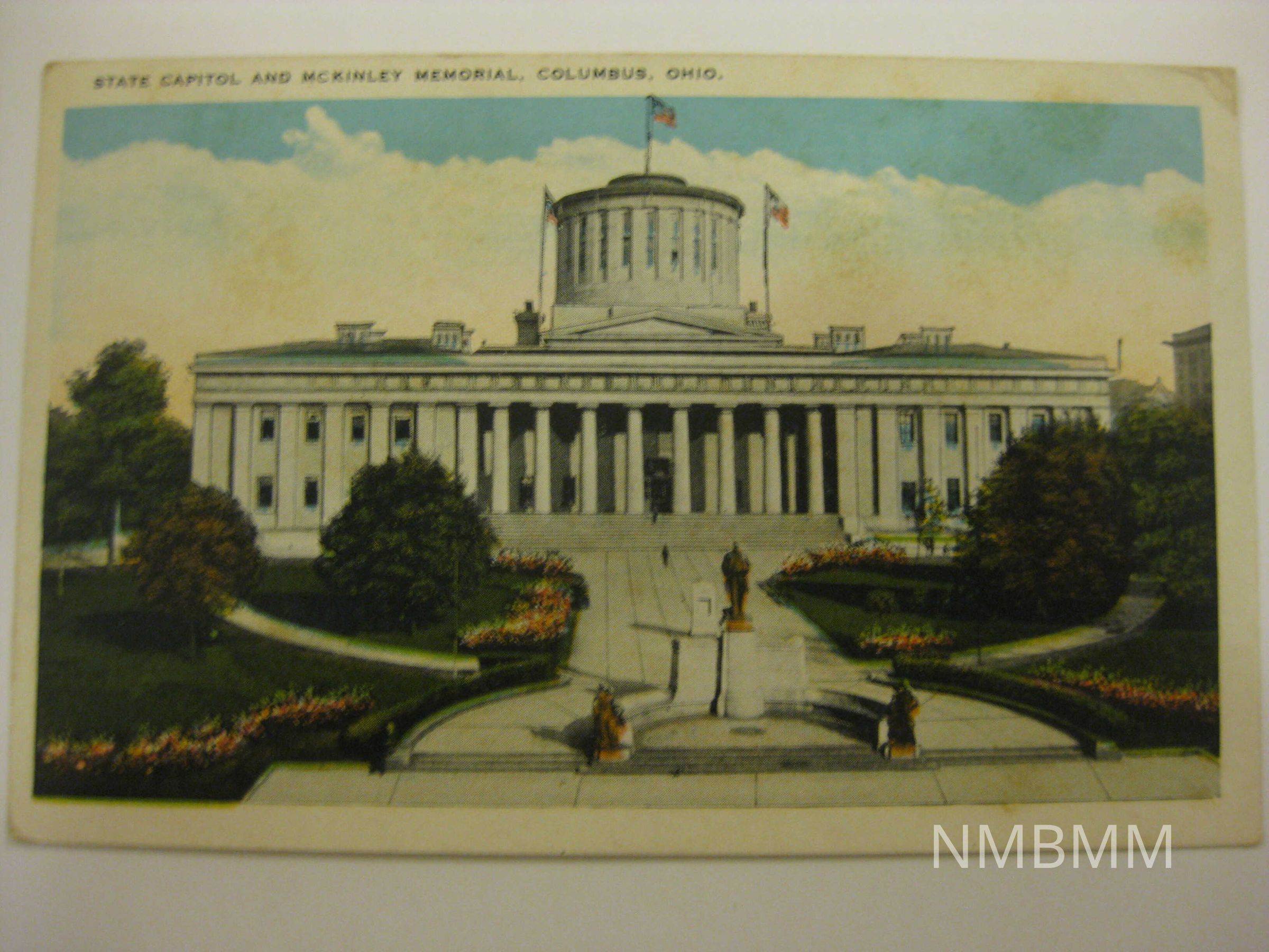 This item is a postcard depicting the Ohio State House, showing the McKinley Monument in the foreground, in Columbus,Ohio. Published by Scott Krauss News Agency, Columbus, Ohio.