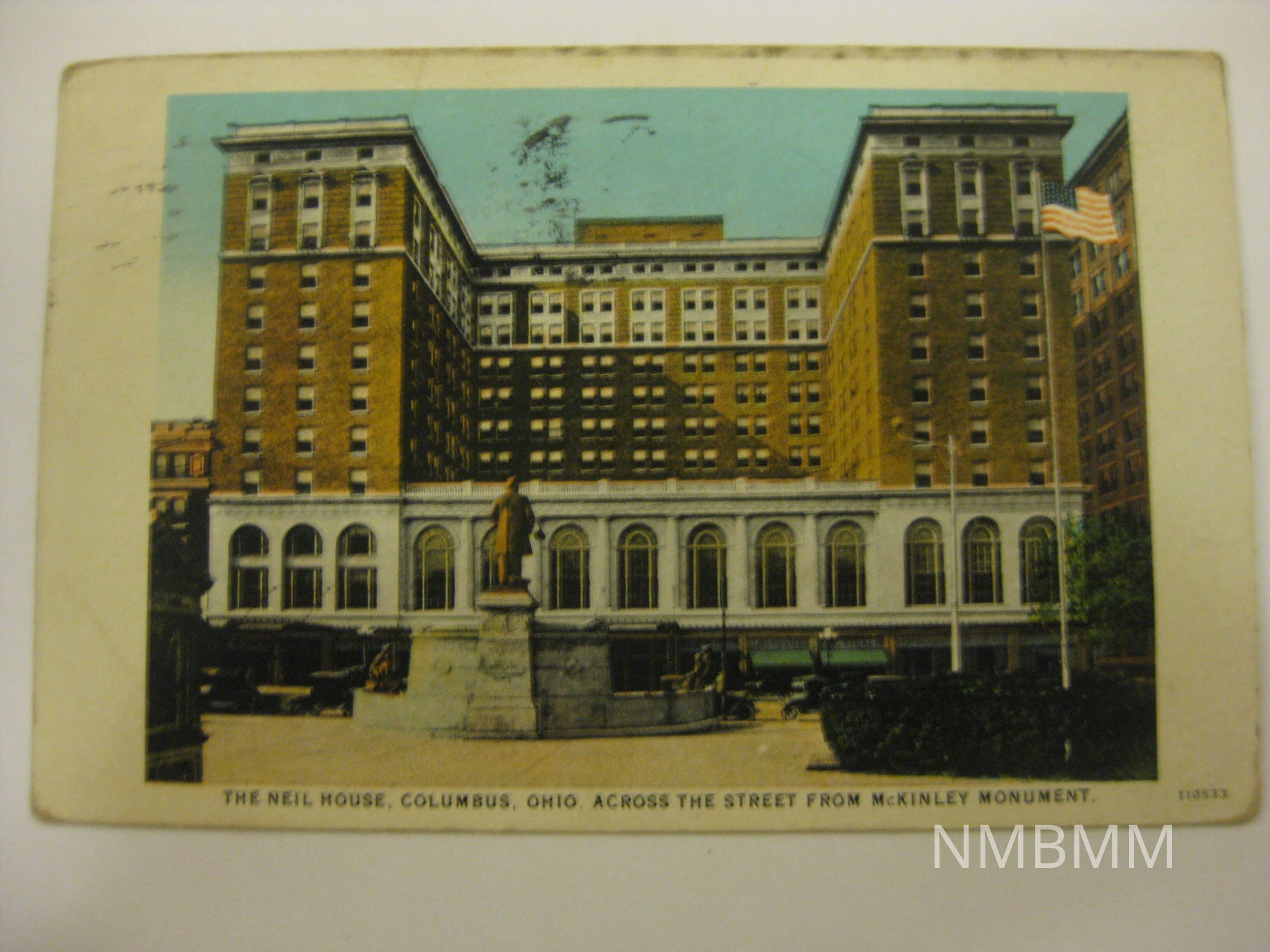 This item is a postcard depicting the Neil House in Columbus, Ohio. The building is facing the State Capitol and the McKinley statue out front. The building is U shaped with an American Flag on the right side. Published by Roscoe Dixon, Columbus Ohio.Collection