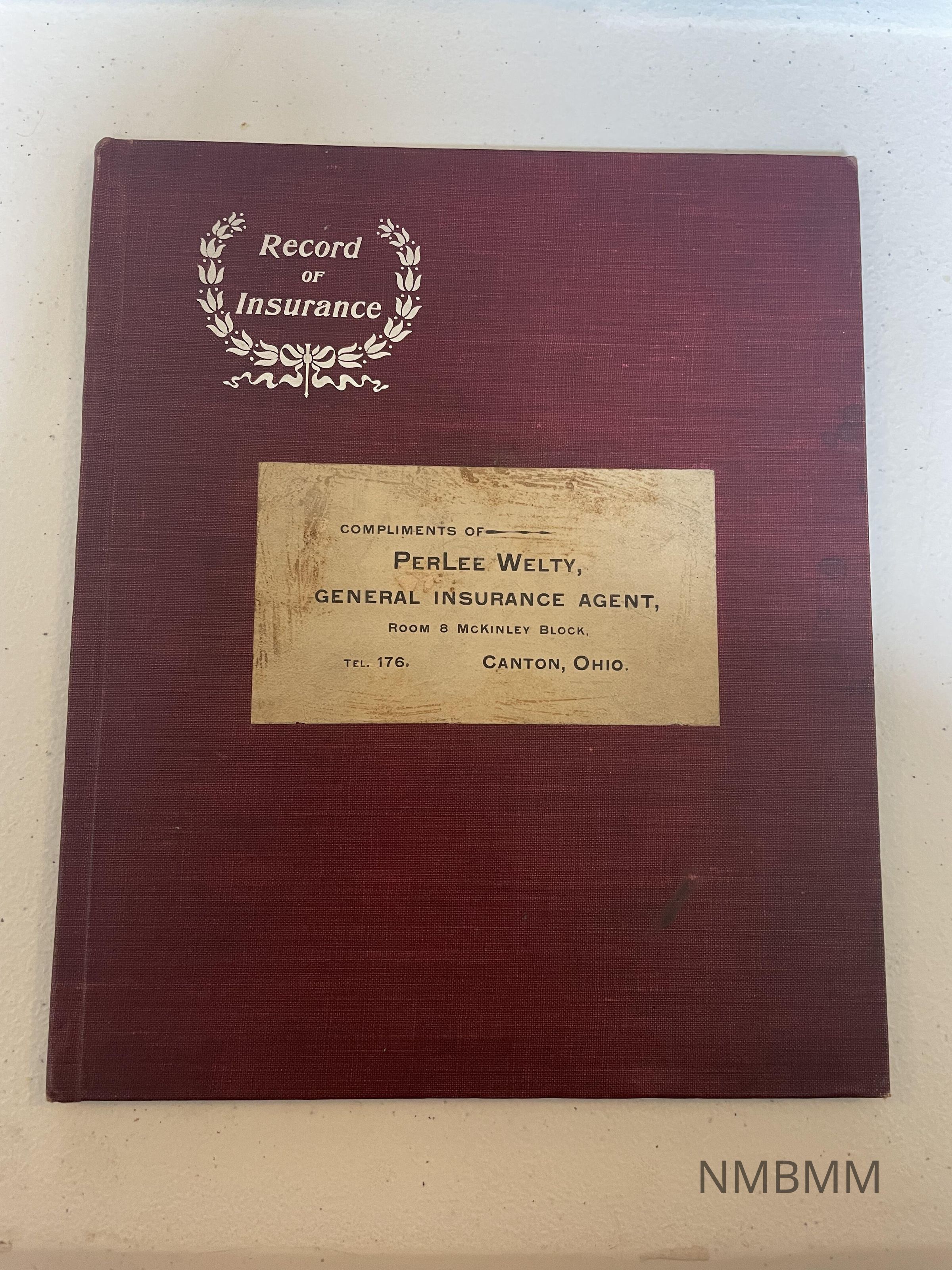 The book is titled "Insurance Record for the Merchant, the Manufacturer, The Banker, and Broker." Reproduction book containing McKinley property transactions. Cover says, "Compliments of PerLee Welty, General Insurance Agent, Room 8 McKinley Block. Tel. 176. Canton, Ohio."