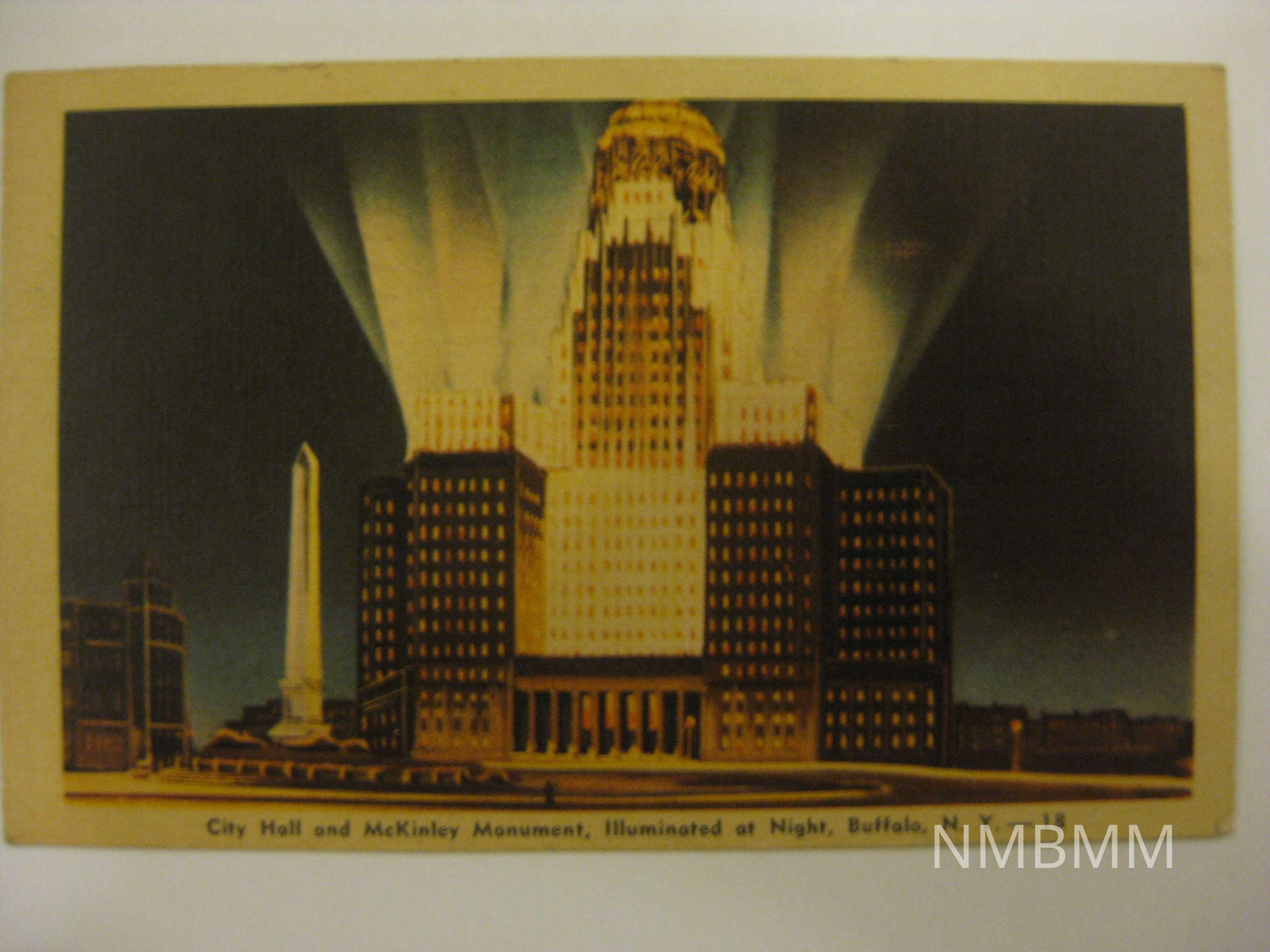 This item is a postcard depicting the McKinley Obelisk in Buffalo, NY,with the City Hall building in the background. The building is lit up because it is dark. It is addressed to Alta McKinley, and it reads," Dear Alta, Had a nice trip with seat all the way. Lareta & Albert met me. Rather cool and windy today."