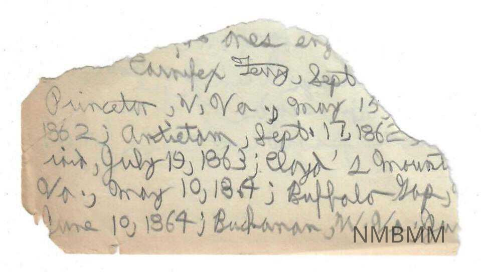 This is a small piece of paper torn from a page notes were written on and found inside the book, "The Illustrious Life of William McKinley" by Murat Halstead (Accession # 2010.1.1735a). On one side is hand written in script what appears to be a list of battles of the Ohio Twenty-third regiment that William McKinley participated in during the civil war. Since this is a torn section from another sheet only a partial list is visible. These are the words hand written in pencil as seen: " Ones en?; Carnifax Ferry, Sept; Princeton, W. Va., May 1?, 1862 ; Antietam, Sept. 17, 1862; raid, July 19, 1863; Cloyd's Mount, Va., May 10, 1864; Buffalo Gap, June 10, 1864; Buchanan, W. Va. Ju." The reverse side has the following hand written words in pencil: "of four...ways been so [pro] and ..ith records of this [b]e proud of their boys?