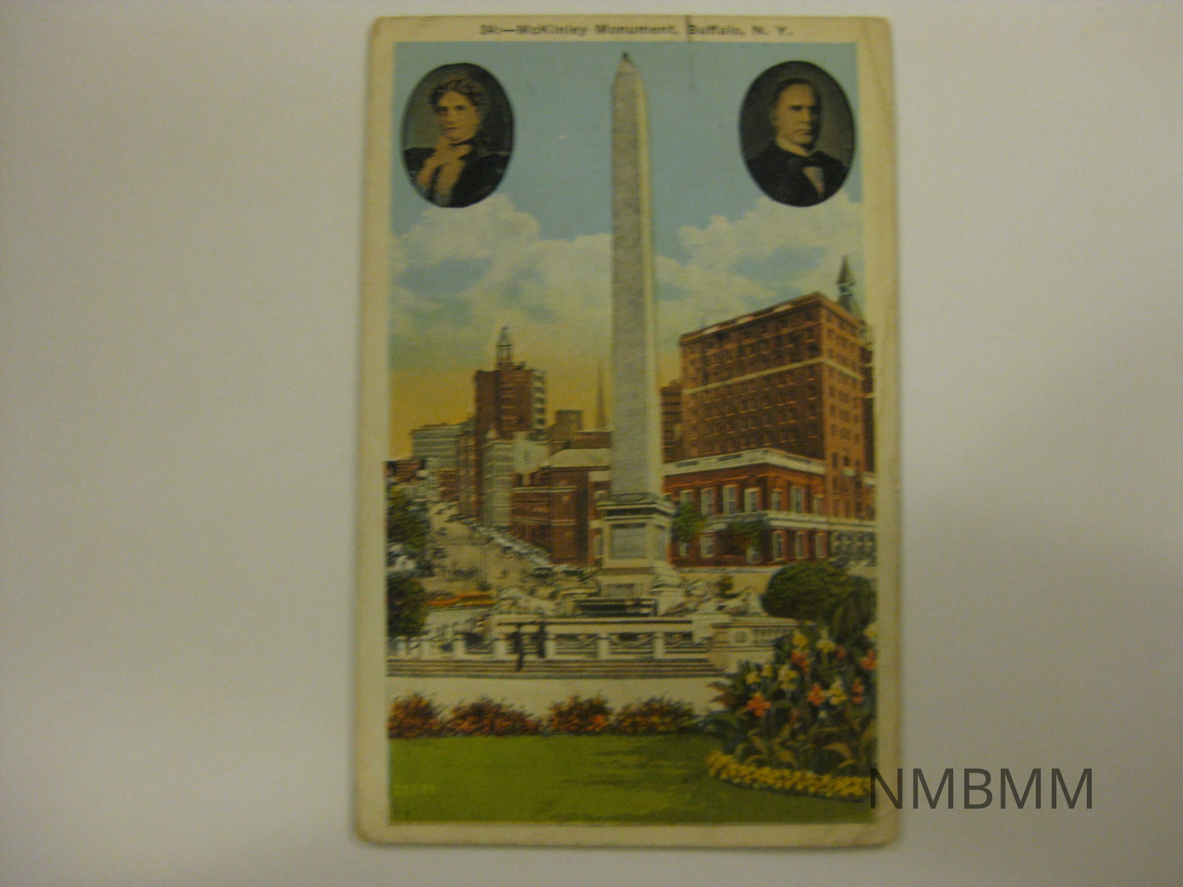 This item is a postcard depicting the McKinley Monument that was constructed in Buffalo, NY. The monument is in the foreground, the city is in the background, and there are portraits of President McKinley and Ida McKinley. The card is addressed to Henry Edmonds. Published by W.G. Macfarlane, Buffalo , NY.