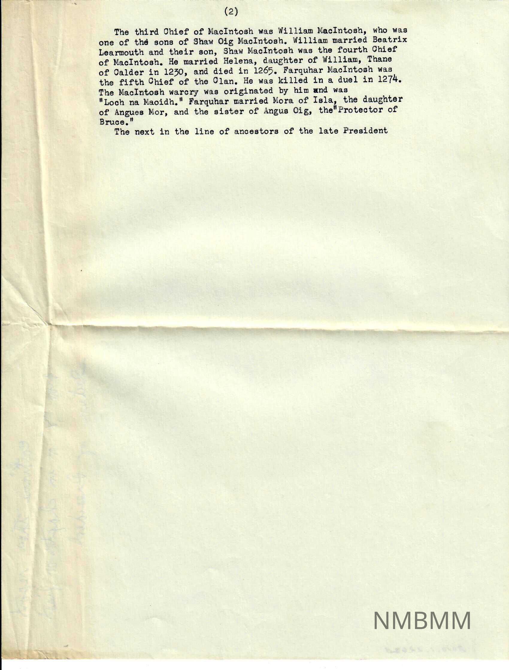 This is a sheet of paper found folded inside the book, "The Illustrious Life of William McKinley" by Murat Halstead (Accession # 2010.1.1735a). It is written using a typewriter and is a partial history of the ancestral geneology of President William McKinley. The front side has the number two typed and centered on the page in parentheses.