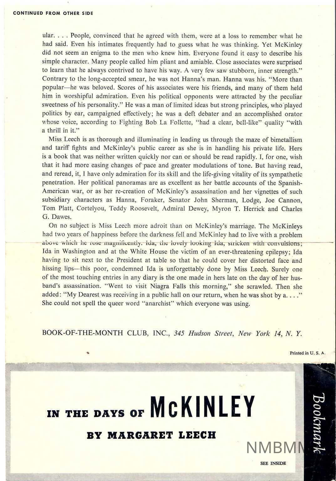 Bookmark is titled "In the Days of McKinley by Margaret Leech. A "Report by John Mason Brown" gives a summary of the book written by Leech, and is "Reprinted from the Book-of-the-Month Club News." A photo of the U.S.S. Maine in Havana Harbor is featured in the article.