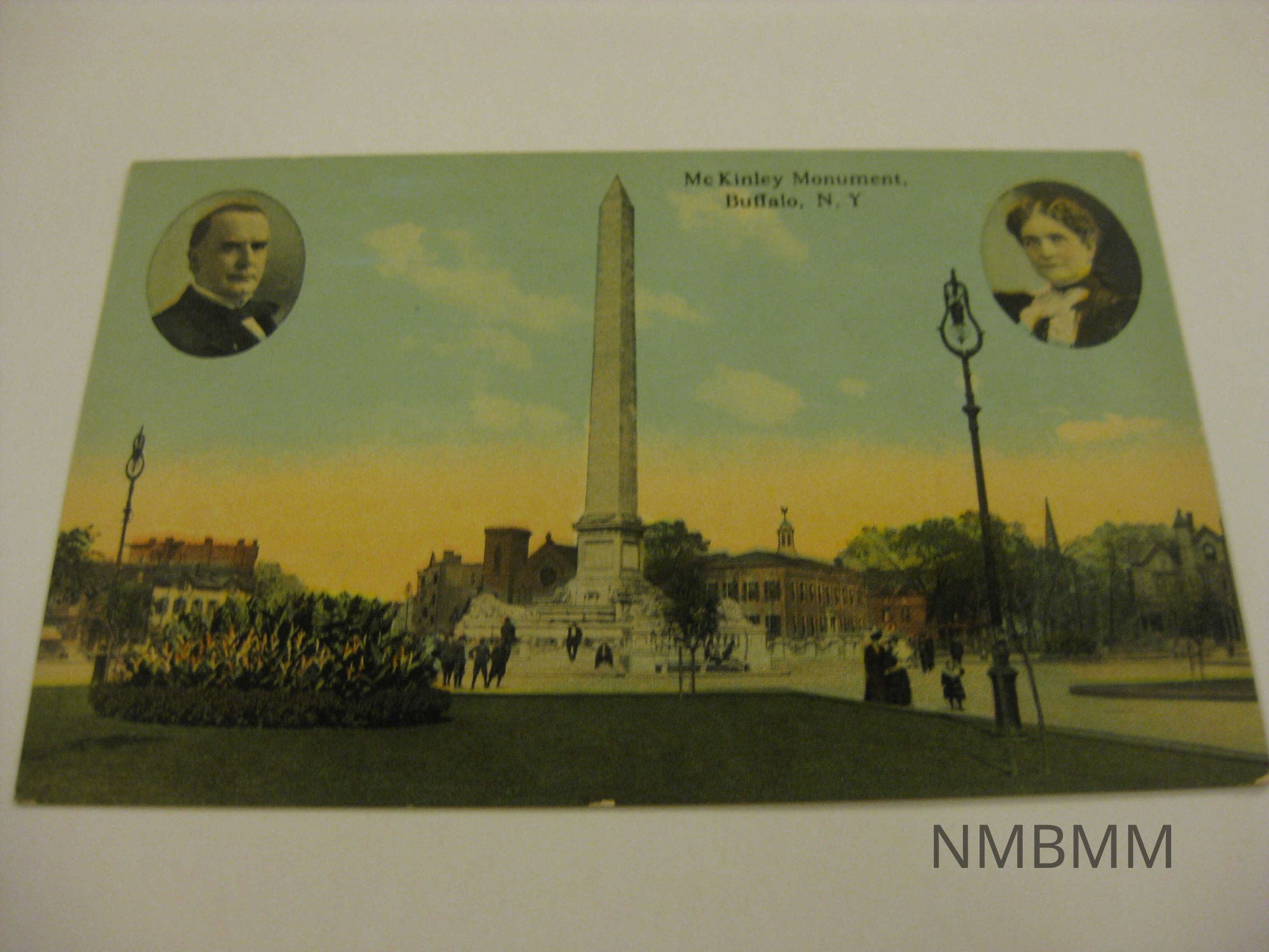 This item is a postcard depicting the McKinley Monument that was constructed in Buffalo, NY. The monument is in the foreground, a church is in the background, and there are portraits of President McKinley and Ida McKinley.Collection