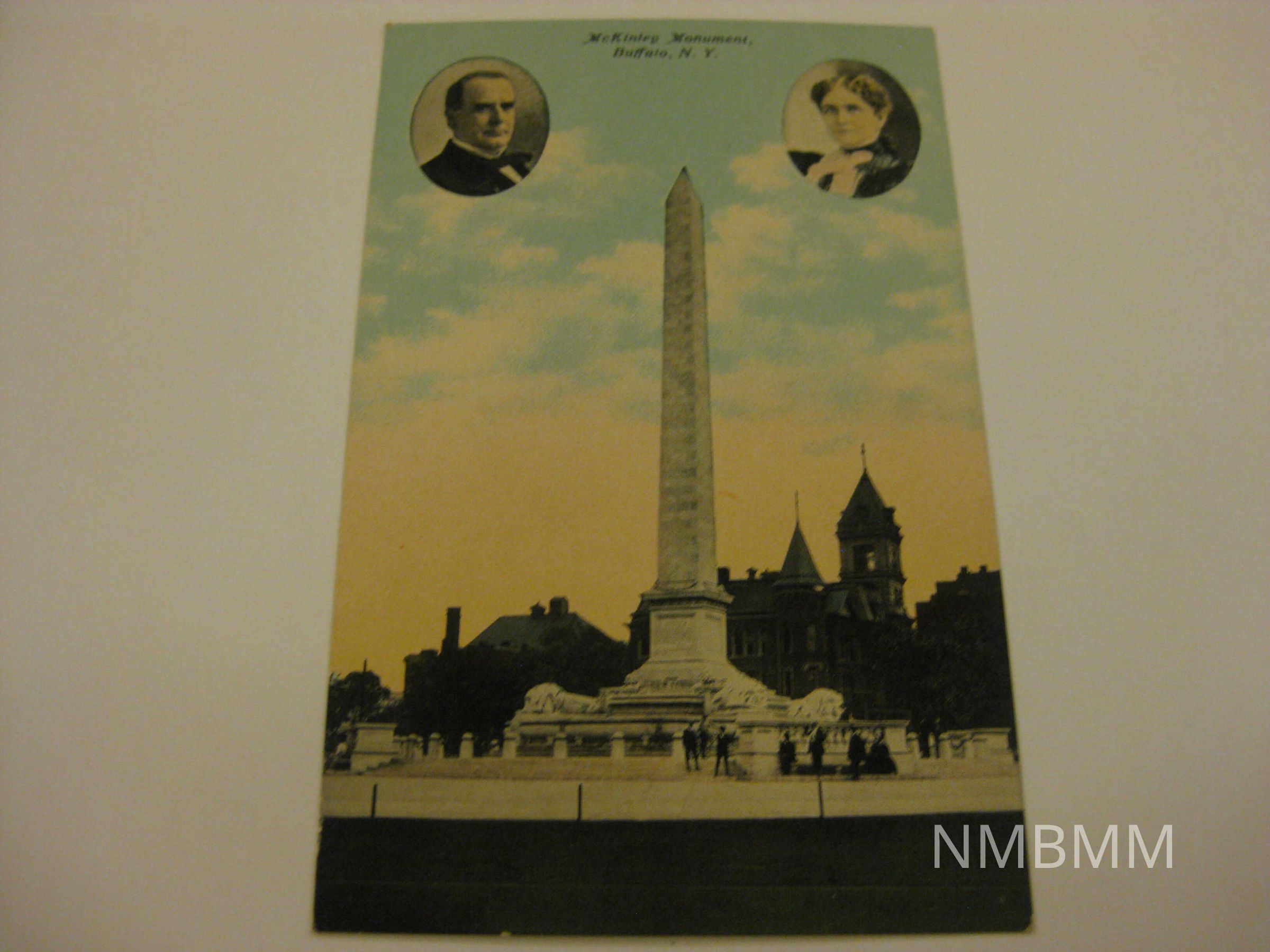 This item is a postcard depicting a drawing of the McKinley Monument that was constructed in Buffalo, with portraits of President McKinley and Ida McKinley.