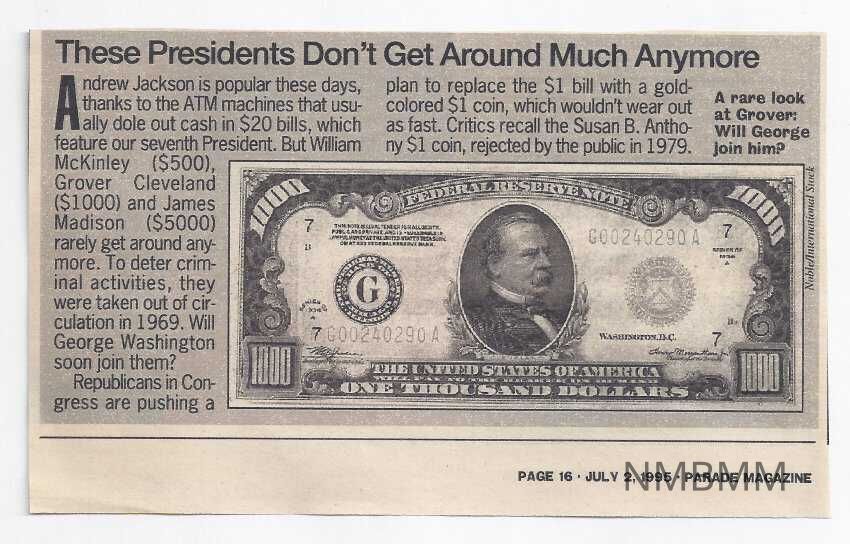 These Presidents Don't Get Around Much Anymore Andrew Jackson is popular these days, thanks to the ATM machines that usually dole out cash in $20 bills, which feature our seventh President. But William McKinley ($500), Grover Cleveland ($1000) and James Madison ($5000) rarely get around anymore. To deter criminal activities, they were taken out of circulation in 1969. Will George Washington soon join them? Republicans in Congress are pushing a plan to replace the $1 bill with a gold-colored $1 coin, which wouldn't wear out as fast. Critics recall the Susan B. Anthony $1 coin, rejected by the public in 1979. picture: A rare look at Grover; will George join him?