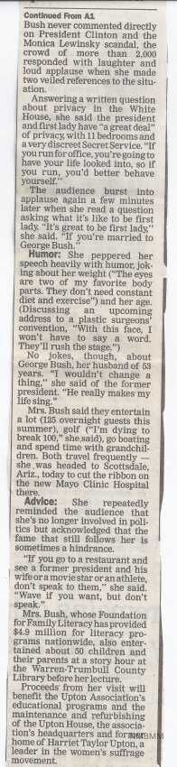 ... Bush never commented directly on President Clinton and the Monica Lewinsky scandal, the crowd of more than 2,000 responded in laughter and loud applause when she made two veiled references to the situation.
