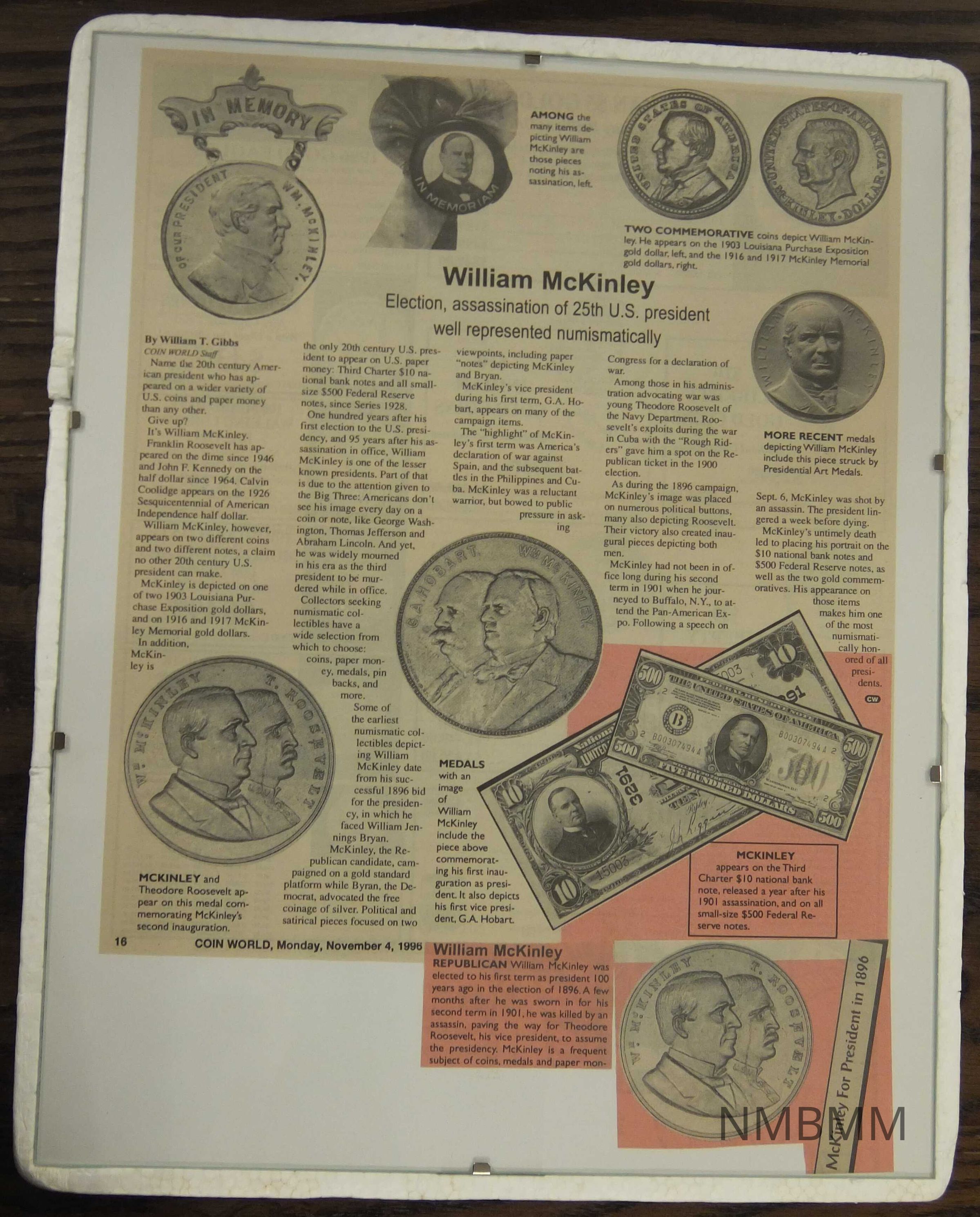 This item is a newspaper article taken from Coin World which discusses the different types of currency on which McKinley as President has appeared. The article is titled "William McKinley, Election, assassination of 25th U.S. president well represented numismatically" by William T. Gibbs. Photographs are included in the article.Collection