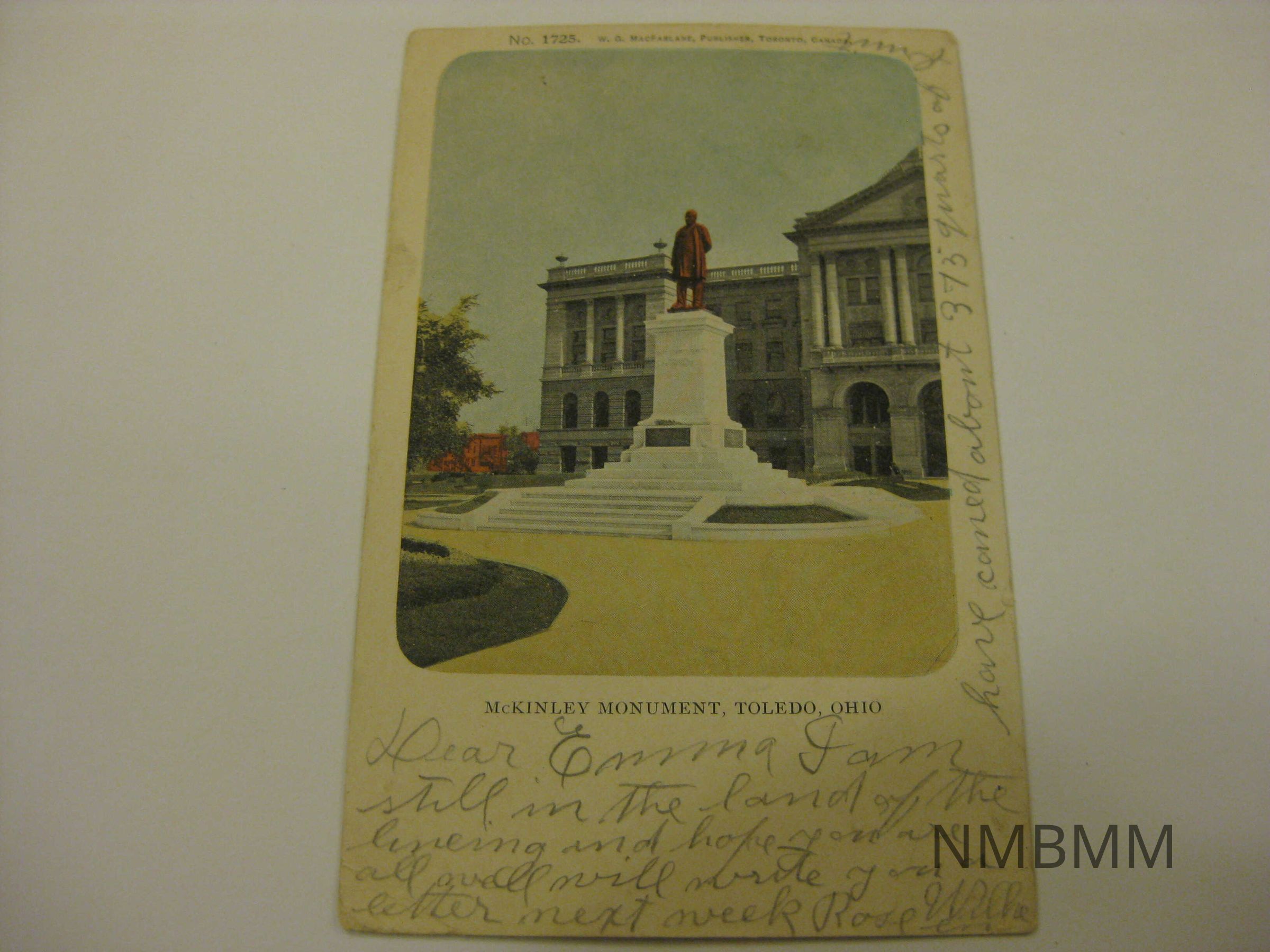 This item is a postcard depicting the statue of President McKinley atop a white base in Toledo, Ohio. The card is addressed to Emma Worthmiller. On the front, there is writing that read, "Dear Emma, I am still in the land of the living and hope you are all well. Will write you a letter next week. Rose."Collection