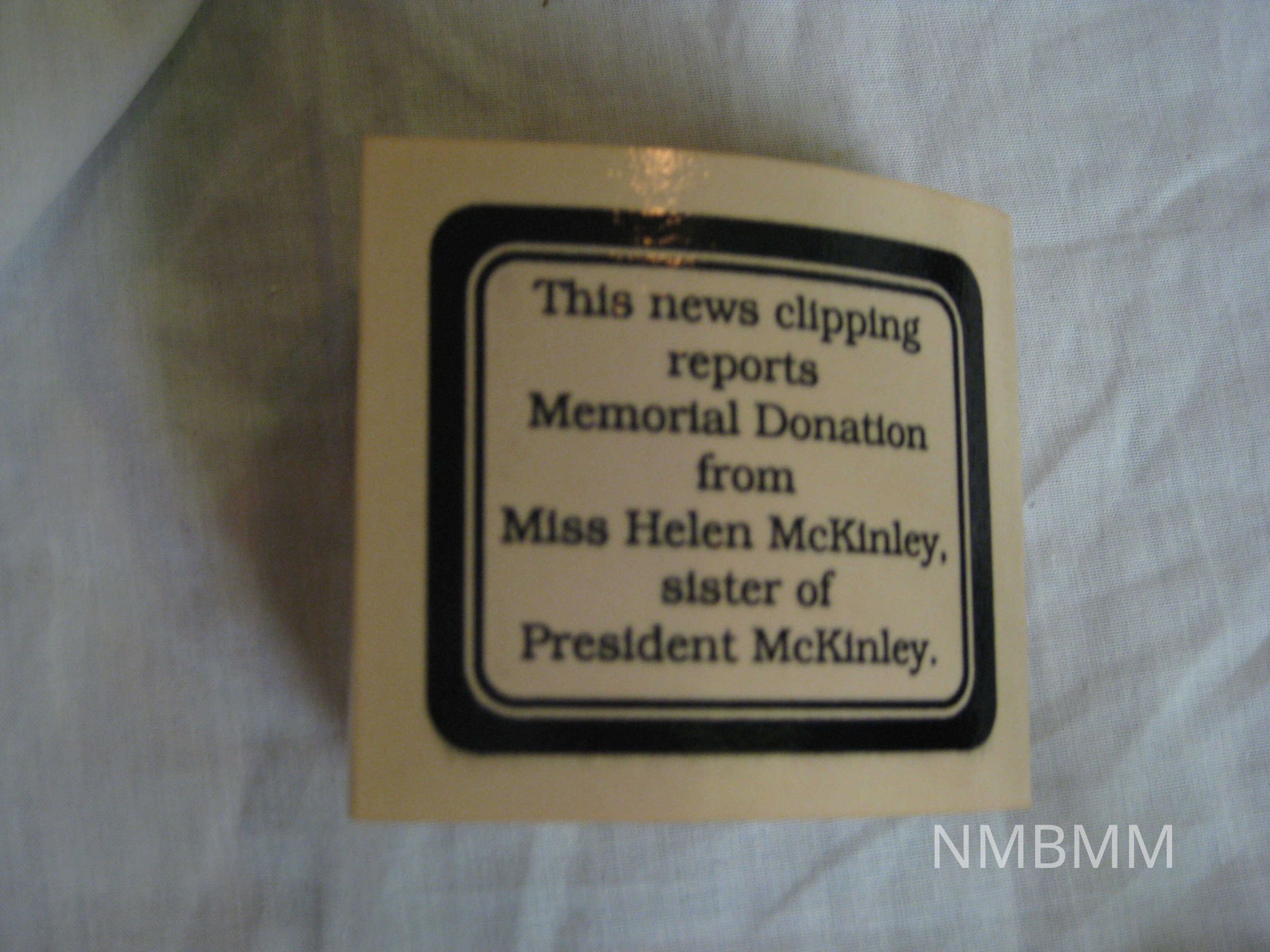 NEWSPAPER CLIPPING OF WILLIAM MCKINLEY'S SISTER HELEN'S $100 DONATION TO THE MCKINLEY MEMORIAL. WOOD FRAME. 12" X 4"Collection