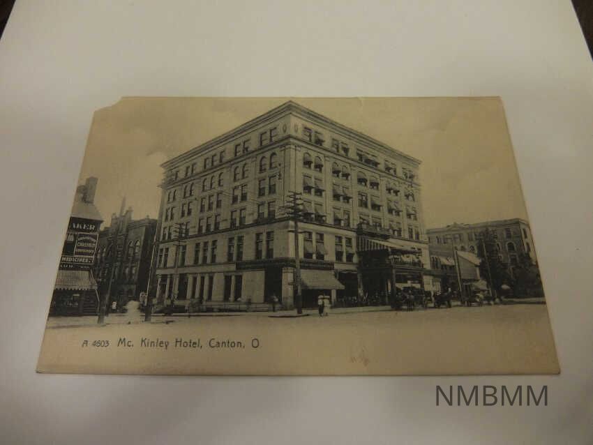 This item is a postcard containing a picture of the McKinley Hotal in Canton, Ohio. Outside of the building are two women walking and a horse drawn carriage. The building next to the hotel has an advertisement for Medicine. Published by the Rotograph Company, New York, NY.