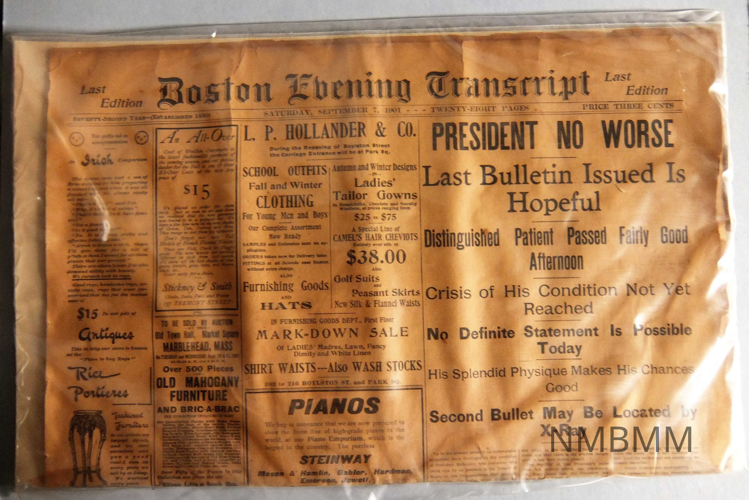 The item is a Boston Evening Transcript from Saturday, September 7, 1901, one day after President McKinley was shot. The headline of the newspaper reads, "President No Worse." The newspaper is 28 pages long, cost three cents, and was the last edition for the day. The newspaper is covered in a plastic protective sheet and contains an authenticity certificate with it.