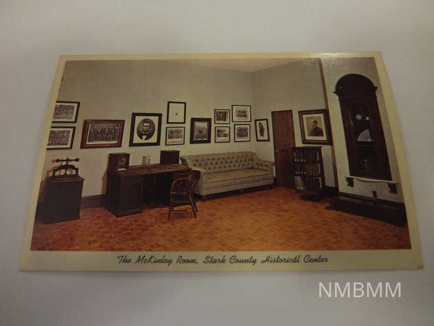 This item is a postcard containing a picture of the McKinley Room at the Stark County Historical Center. In the picture, is a portrat of McKinley, his law desk, and porttrait of President Abraham Lincoln. The back reads, "A view of the McKinley Room showing the McKinley office furniture used in the McKinley Residence once located on Market Ave., North in Canton." Published by City News Agency, Canton, OhioCollection