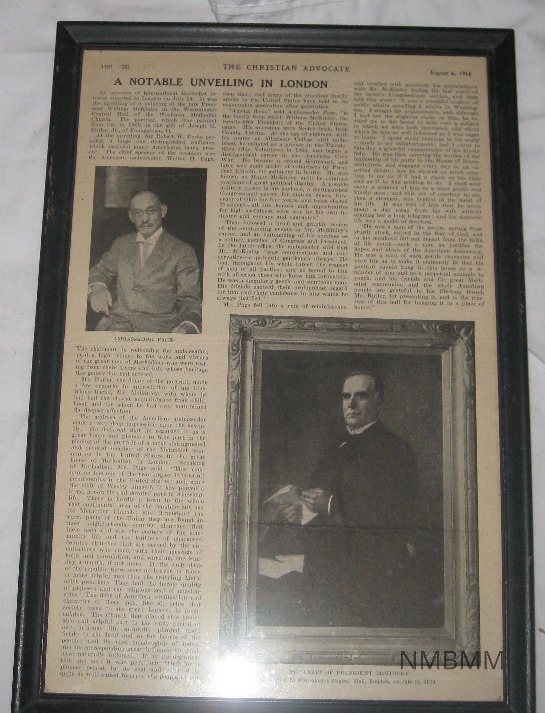 ARTICLE FROM CHRISTIAN ADVOCATE OF AUGUST 6, 1914 REPORTING ON THE UNVEiLING OF A PORTRAIT OF MCKINLEY IN LONDON. BLACK WOOD FRAME. 9" X 13"Collection
