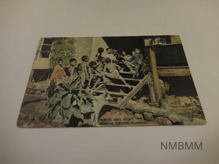 This item is a postcard depicting a group of Philippine children listening to a radio being played. The childen are wearing small garments and a dog stands besidde them. The card is addressed to Mamie England. It reads, "Hellow Mamie. Why dont you write? Are you sick or what. I expect to be in Frisco Jan. 12 and then I will come and see you."Collection