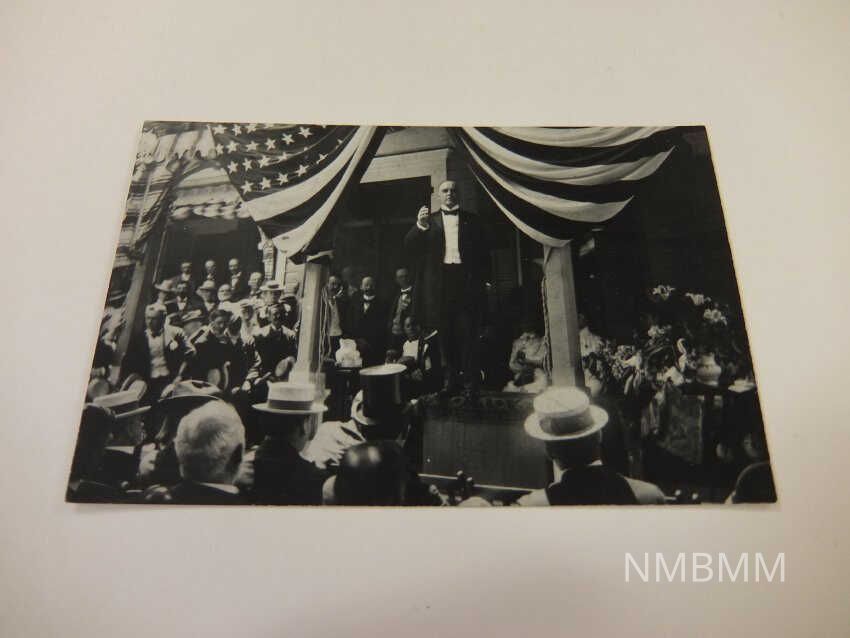 This item is a postcard depicting President McKinley campaigning from his front porch in Canton, Ohio. He is standing on a box surrounded by flags and people. The back reads, "President McKinley Accepting the Nomination for the Second Term, July 12,1900. 40th Annual Exhibition of McKinley Stamp Club of Canton, April 3-4, 1971. Photo from original plate in McKinleyana Collection of Mr. and Mrs. George R. Bechtel, Jr. of Canton, Ohio."