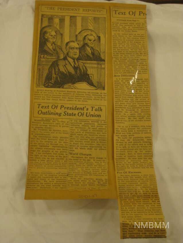 The item is a newspaper article titled, " The President Reports." There is an artist's drawing of President Roosevelt, VIce President John Nance Garner, and Rep. Joseph Byrns. The article contains text of the President's talk outlining the State of the Union. The article is from January 4, 1934. After researching when the 73rd congress began its session we came up with the year 1934 since no year was given on the article. The President's speech was divided up into 3 sections: World Changes, New Difficulties, and Foe of Excesses.Collection