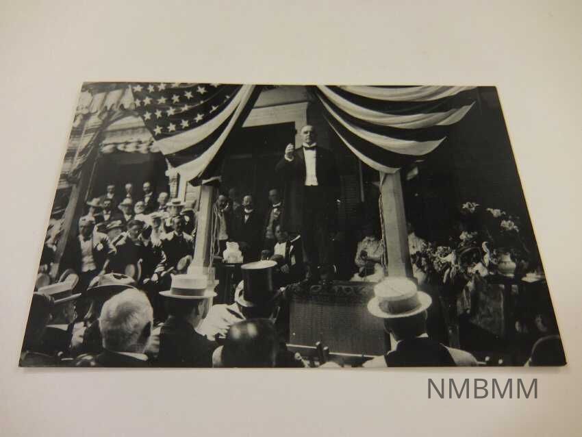 This item is a postcard depicting President McKinley campaigning from his front porch in Canton, Ohio. He is standing on a box surrounded by flags and people. The back reads, "President McKinley Accepting the Nomination for the Second Term, July 12,1900. 40th Annual Exhibition of McKinley Stamp Club of Canton, April 3-4, 1971. Photo from original plate in McKinleyana Collection of Mr. and Mrs. George R. Bechtel, Jr. of Canton, Ohio."Collection