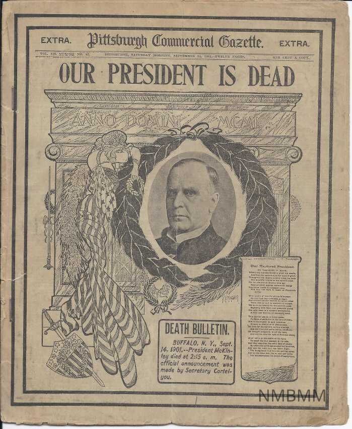 A replica of the Pittsburgh Commercial Gazette Saturday Morning Issue Vol. 116, No. 42 that announced President McKinley's death with a bulletin with the headline "Our President is Dead".Collection