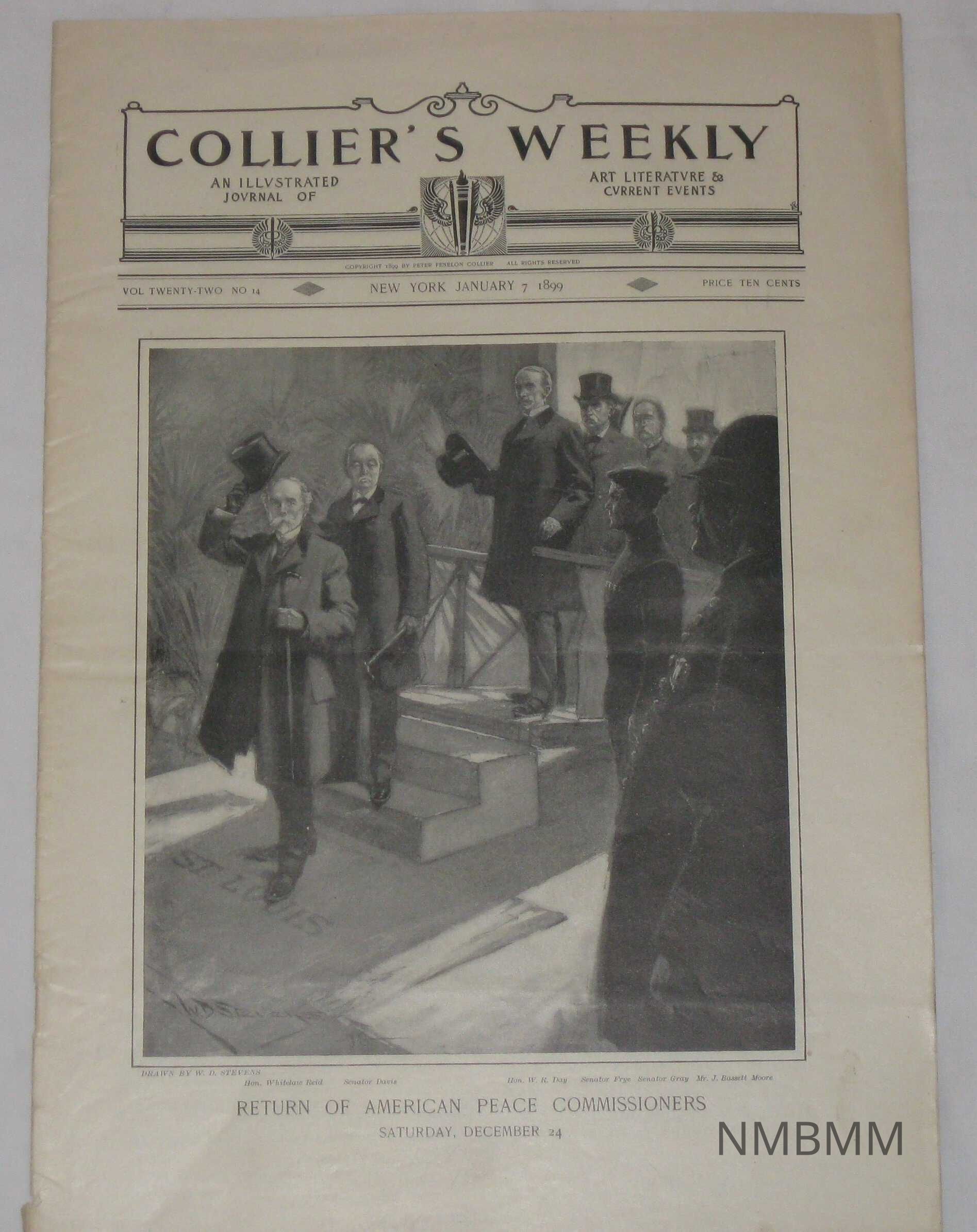 An issue of Collier's Weekly, an illustrated journal of art, literature and current events, vol. 22 No. 14, published January 7, 1899. The cover features an illustration of the U.S. Peace Commissioners for Anglo-American Commission, with the cpation "Return of American Peace Commissioners, Saturday, December 4th"