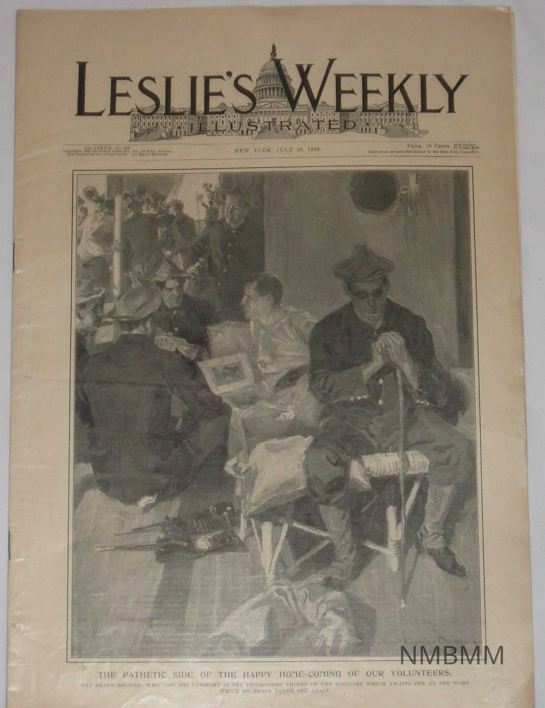 An issue of Leslie's Weekly Illustrated, Vol. LXXXIX No. 2288. It was copyrighted by the Judge Company on 110 Fifth Avenue and published in New York on July 20, 1899. The cover has an illustration of soldiers on a ship, and one of them is blind with a cane, with the caption "The Pathetic Side of The Happy Home-coming of Our Volunteers, the brave soldier who lost his eyesight in the Philippines. Thinks of the welcome, which awaits him at the home which he shall never see again.Collection