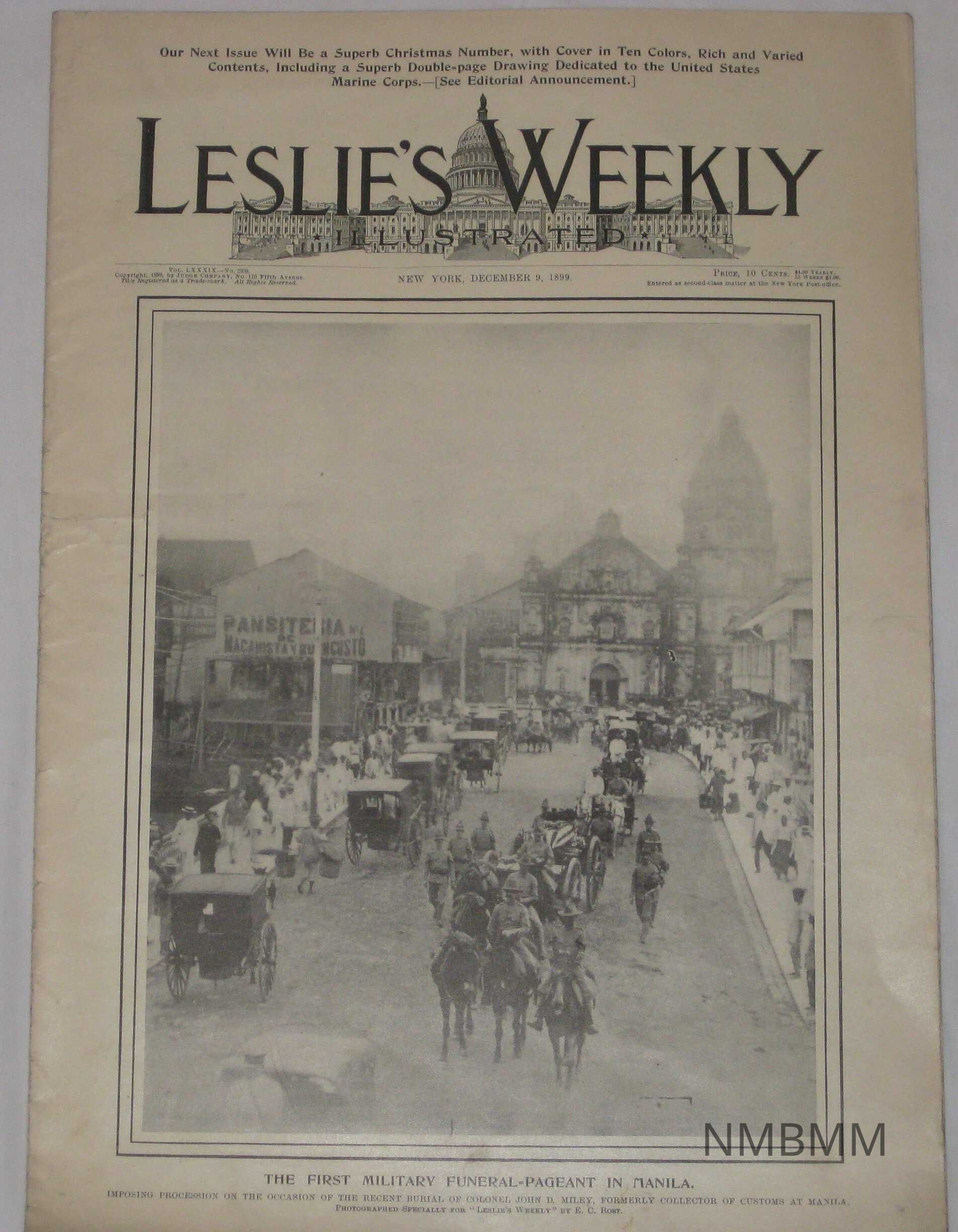 An issue of Leslie's Weekly Illustrated, Vol. LXXXIX No. 2309. It was copyrighted by the Judge Company on 110 Fifth Avenue and published in New York on December 9, 1899. Printed at the top is " Our Next Issue Will Be a Superb Christmas Number, with Cover in Ten Colors, Rich and Varied Contents, Including a Superb Douple-page Drawing Dedicated to the United States Marine Corps." The cover is a photograph of a military funeral pageant in the streets of Manila, with the caption "The First Military Funeral Pageant in Manila, imposing propcession to the occasion of the recent burial of Colonel John D. Miley, formerly collector of customs at Manila." - Photographed specially for "Leslie's Weekly" by E.C. Rost.Collection