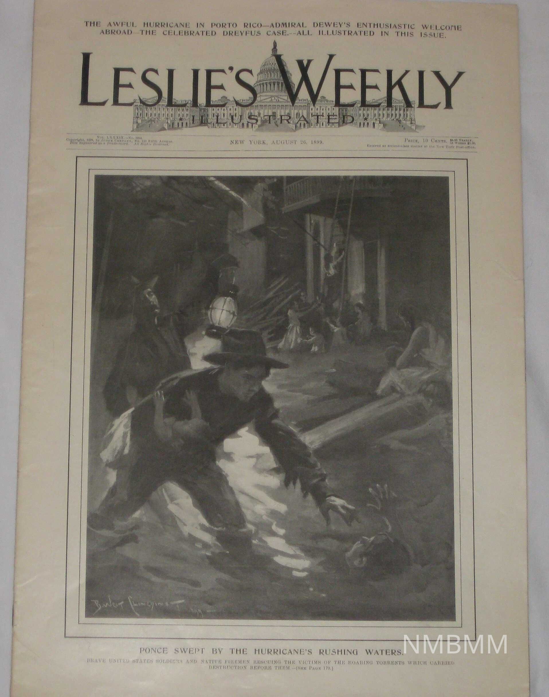 An issue of Leslie's Weekly Illustrated, Vol. LXXXIX No. 2294. It was copyrighted by the Judge Company on 110 Fifth Avenue and published in New York on August 26, 1899. Printed at the top is "The Awful Hurricane in Porto Rico--Dewey's Enthusiastic Welcome Abroad-- The Celebrated Dreyfys Case, All Illustrated in This Issue." The cover is an illustration of an American soldier reaching to save a person from a flood in Puerto Rico, with the caption, "Ponce Swerpt by the Hurricanes Rushing Waters, Brave United States soldiers and native firemen rescuing the victims of the roaring torrents which carried destruction before them."Collection