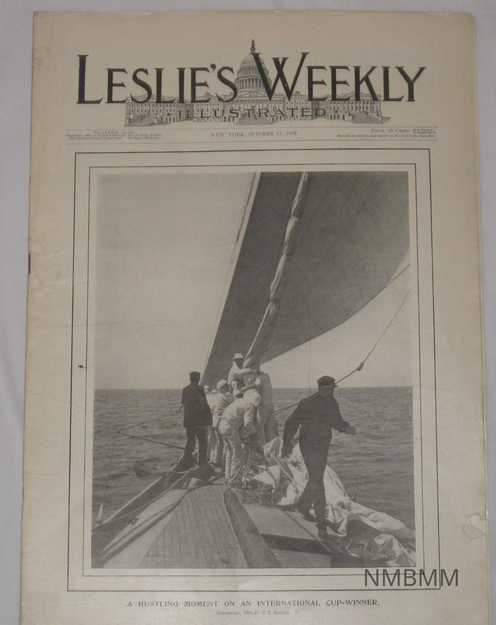 An issue of Leslie's Weekly Illustrated, Vol. LXXXIX No. 2301. It was copyrighted by the Judge Company on 110 Fifth Avenue and published in New York on October 14, 1899. The front cover is a photo of several men on a boat, with the caption "A Hustling Moment on An International Cup-Winner."Collection