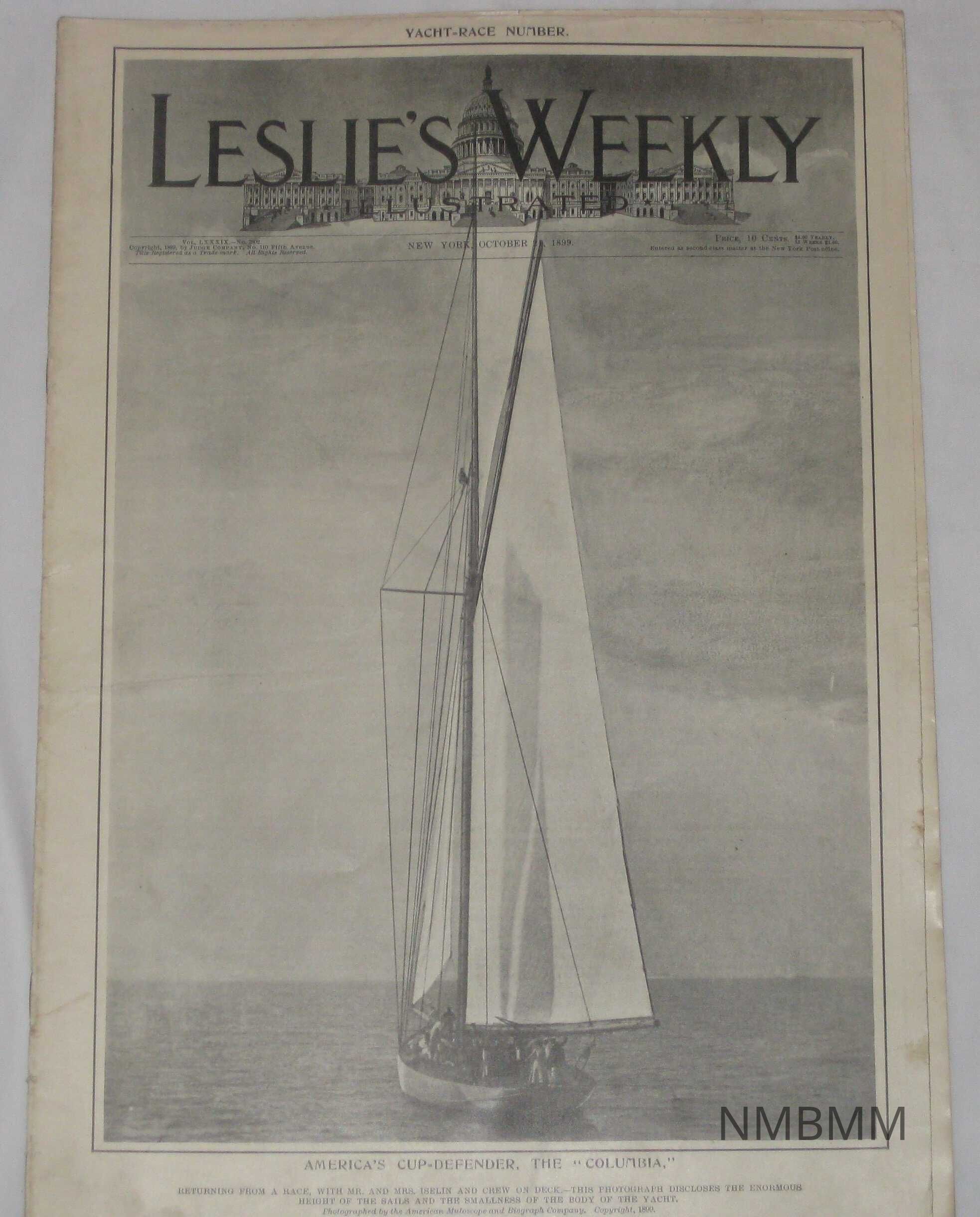 An issue of Leslie's Weekly Illustrated, Vol. LXXXIX No. 2302. It was copyrighted by the Judge Company on 110 Fifth Avenue and published in New York on October 14, 1899. This issue was title the Yacht Race Number, it features a photo of the yacht named the "Columbia". The caption below reads "America's Cup-Defende3r the "Columbia". Returning from a race, with Mr. And Mrs. Iselin and crew on deck. This photograph discloses the enormous height of the sails and the smallness of the body of the yacht.