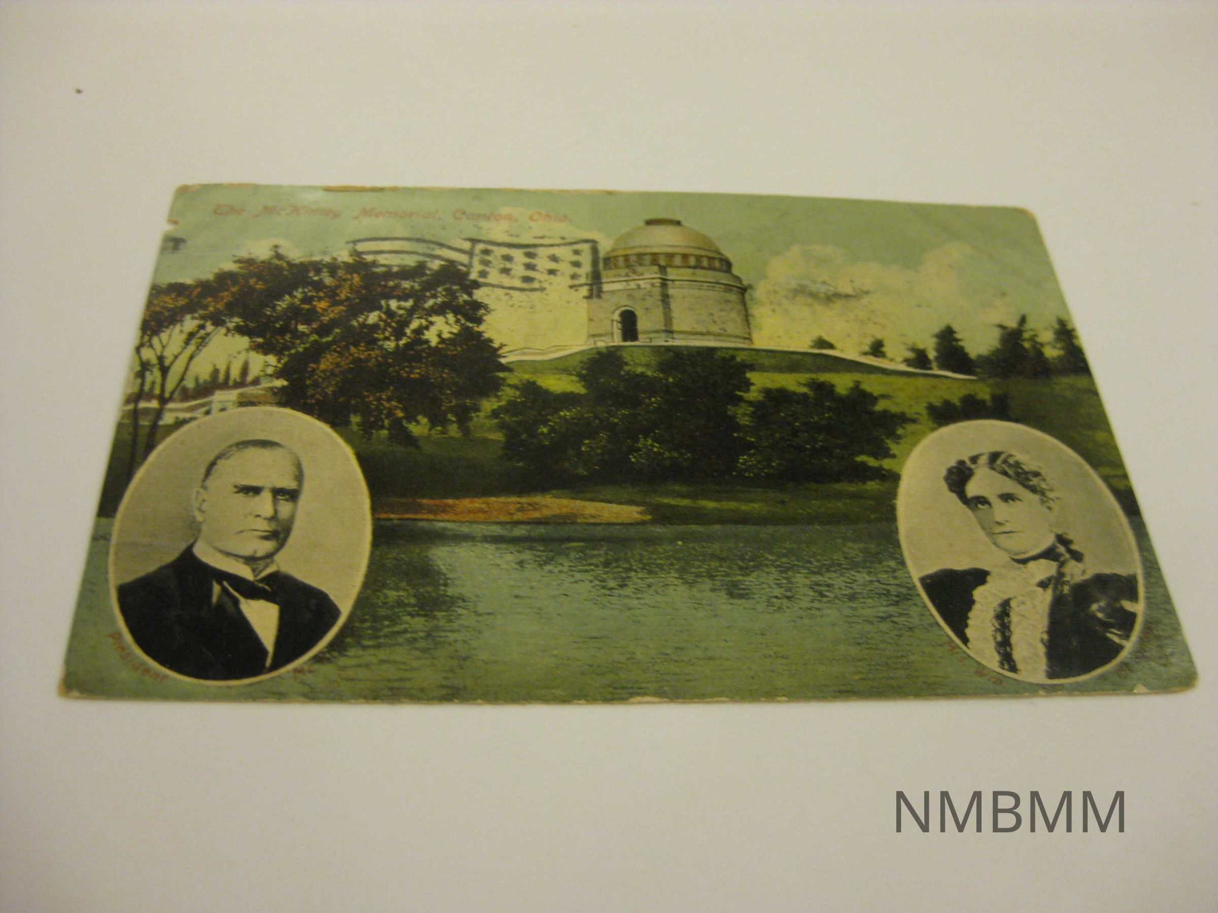 This item is a horizontal hand colored postcard with an image of the McKinley Memorial, Canton, Ohio. There is also two oval black and white portraits of President McKinley and Mrs. Wm McKinley. The portraits are displayed below the memorial. Their names are written in red below portraits. American flag stamp on front. Split back: green Benjamin Franklin one cent stamp, postmark Canton, Ohio Sep 30 10-AM 1910, Mrs. [illegible letter] W Hosler Jeromesville Ohio, D13305, Pub. by The News Exchange Co., Canton, Ohio. Made in Germany. Mezzochrome ANC N.Y. Leipzig Berlin Dresden.