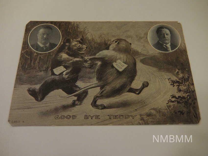 This item is a postcard containing a cartoon of a bear and a possum shaking hands. The bear is wearing glasses with the tag "Teddy Bear", and the possum has a tag saying "bully possum." At the top, are portraits of Theodore Roosevelt and William H. Taft. In the background is the U.S. Capitol Building. On the bottom, is the caption "Good Bye Teddy".Collection