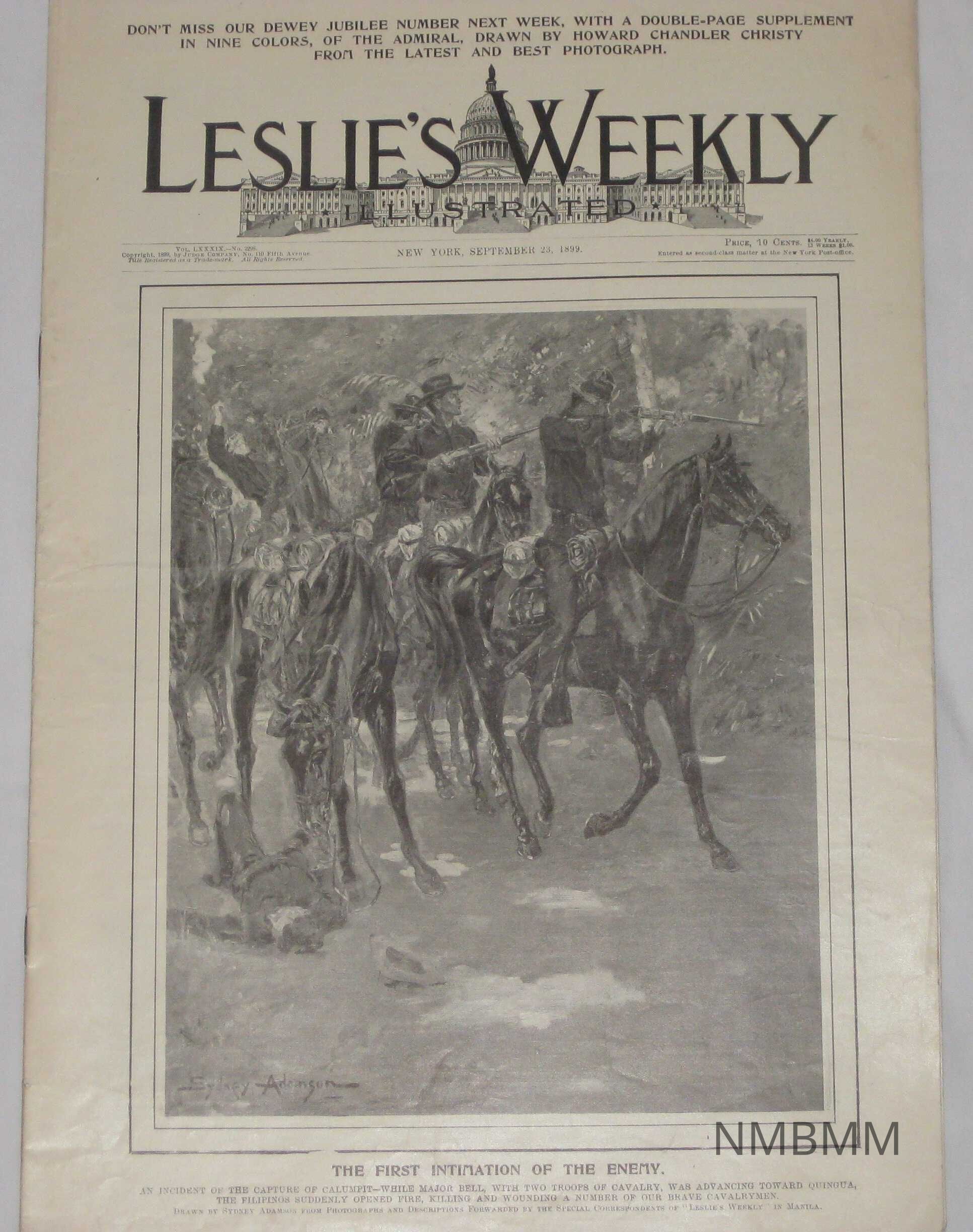 An issue of Leslie's Weekly Illustrated, Vol. LXXXIX No. 2298. It was copyrighted by the Judge Company on 110 Fifth Avenue and published in New York. Printed at the top of the issue is "Don't Miss our Dewey Jubilee Number Next Week, With A Douple-Page Supplement in Nine Colors, of The Admiral Drawn by Howard Chandler Christy From the Latest And Best Photograph? On the front cover there is a picture of soldiers on horseback with the title First Intimation of the Enemy. The caption reads "An Incident of the Capture of Calumpit- While Major Bell, with two troops of Cavalry was advancing toward Quingua, the Filipinos suddenly opened fire, killing and wounding a number of our brave cavalrymen." The cover was drawn by Sydney Adamson.Collection