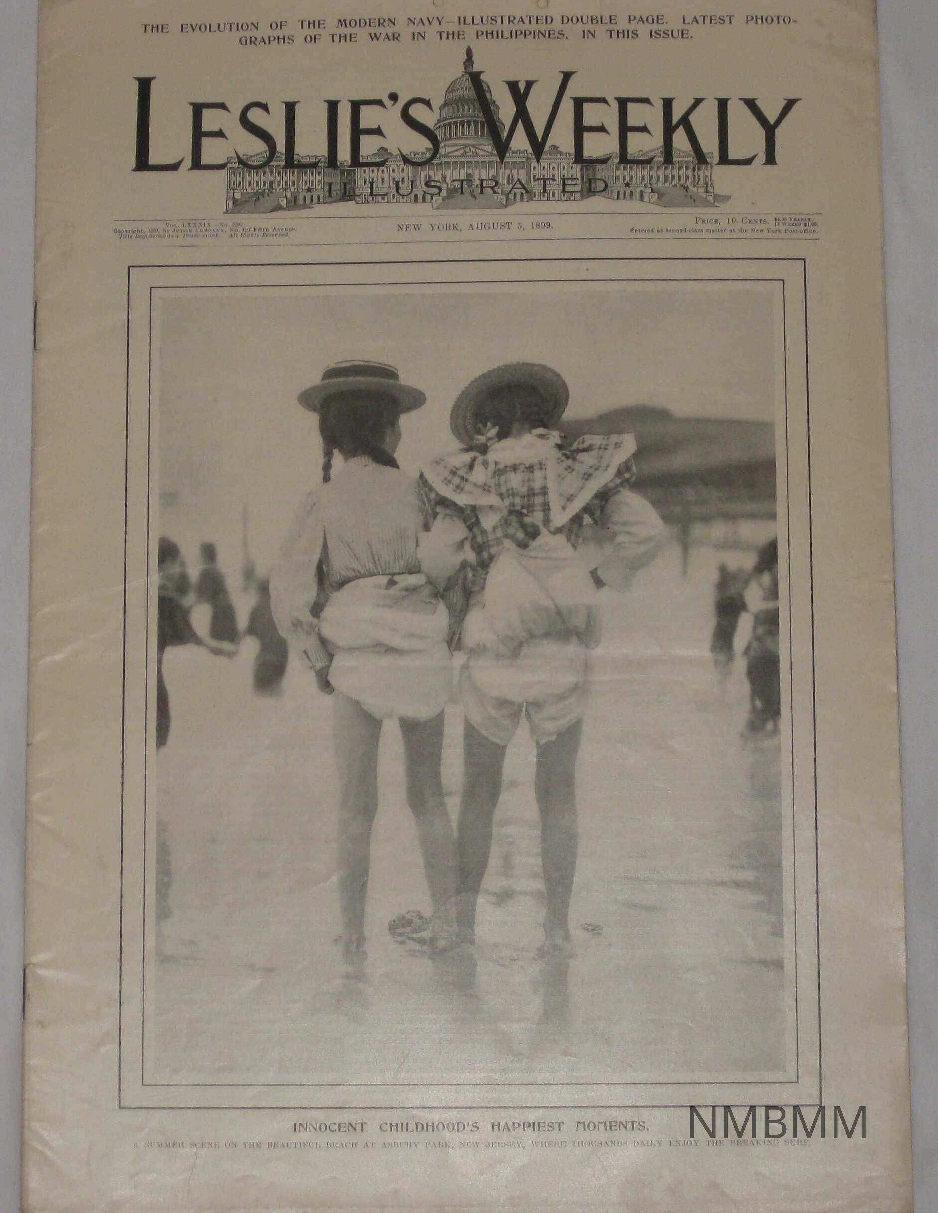 An issue of Leslie's Weekly Illustrated, Vol. LXXXIX No. 2291. It was copyrighted by the Judge Company on 110 Fifth Avenue and published in New York on August 5, 1899. Printed at the top of the issue is "The Evolution of the Modern Navy- Illustrated Double Page. Latest Photographs of the War in The Philippines. In this Issue." On the front cover there is a photo of two young girls walking down the beach, with the caption, Innocent Childhood's Happiest Moments. A summer scene on the beautiful beach at Asbury Park, New Jersey, where thousands daily enjoy the breaking surf."Collection