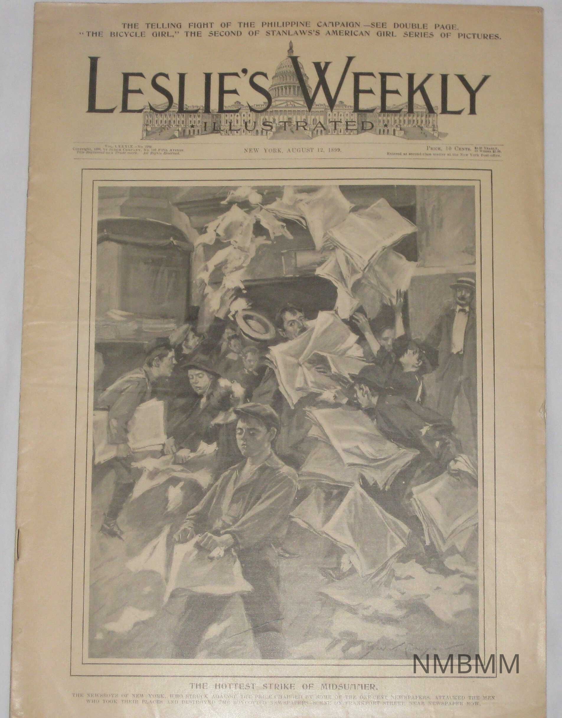 An issue of Leslie's Weekly Illustrated, Vol. LXXXIX No. 2292. It was copyrighted by the Judge Company on 110 Fifth Avenue and published in New York on August 12, 1899. Printed at the top of the issue is "The Telling Fight of the Philippine Campaign-See Double Page. "The Bicycle Girl." The Second of Stanlaw's American Girl Series of Pictures." On the front cover there is an illustration of paper boys ripping up newspapers with the caption "The Hottest Strike of Midsummer, The newsboys of New York, who struck against the price charged by some of the one-cent newspapers, attacked the men who took their places and destroyed the boycotted newspapers- Scene on Frankfort Street, near newspaper row. There is also a photo of President McKinley on page 121.Collection