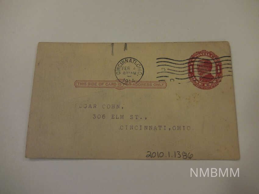This item is a postcard with a printed 1 cent stamp containing President McKinley's portrait, and the back reads, "Syrian Temple, A.A.O.N.M.S., Entertainment, Friday, February 6, 1914, Scotish Rite Cathedral, Musical Comedy, "My Firelight Lady." by Students of Goldenberg School. For members and their families. Admission by 1914 Shrine Card. Saturday Evening, Feb. 7, '14. Business Meeting and reception of petitions for the Reunion Class. At close of the meeting an Illustrated Lecture will be given by Noble Washington T. Porter on "The Cincinnati Southern Railway." For members only." The card is addressed to Edgar Cohn of Cincinnati, Ohio.