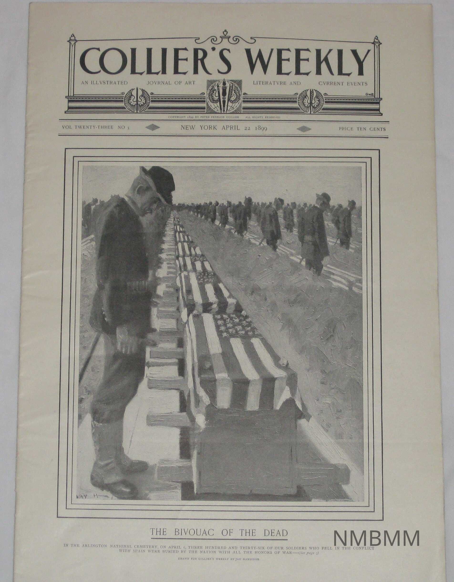 An issue of Collier's Weekly, an illustrated journal of art, literature and current events, Vol. 23 No. 3, published April 22, 1899. The cover features an illustration of a United States soldier standing over coffins draped in the American Flag, with the title, "Bivouac of the Dead". The caption reads, "In the Arlington National Cemetery, on April 6, three hundred and thirty-six of our soldiers who fell in the conflict with Spain were buried by the nation with all the honors of war."Collection