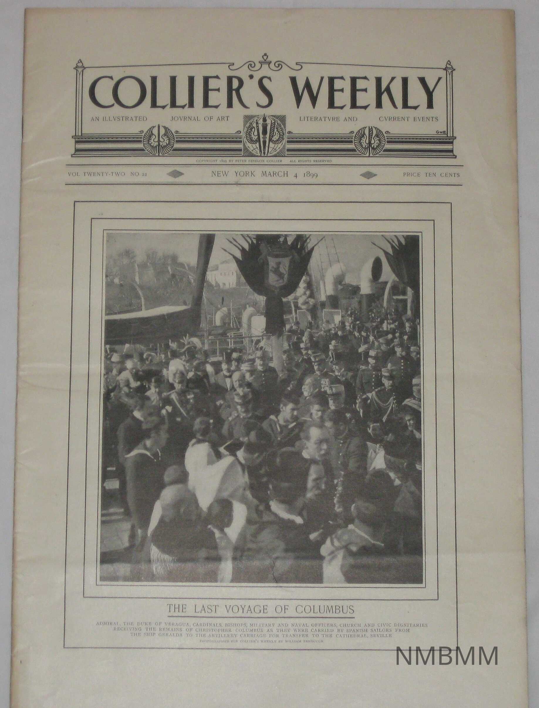 An issue of Collier's Weekly, an illustrated journal of art, literature and current events, Vol. 22 No. 22, published March 4, 1899. Copy right by Peter Fenelon Collier. The cover features a photograph of Cardinals, Bishops, Military and Naval Officers and others recieving the body of Columbus for transport, titled "The Last Voyage of Columbus." Underneath the caption, "Admiral, The Duke of Veragua, Cardinals, Bishops, Military and Naval Officers, Church and Civic dignitaries recieving the remains of Christopher Columbus as they were carried by the Spanish sailors from the ship Geralda to the artillery carriage for transfer to the Cathedral , Seville."Collection
