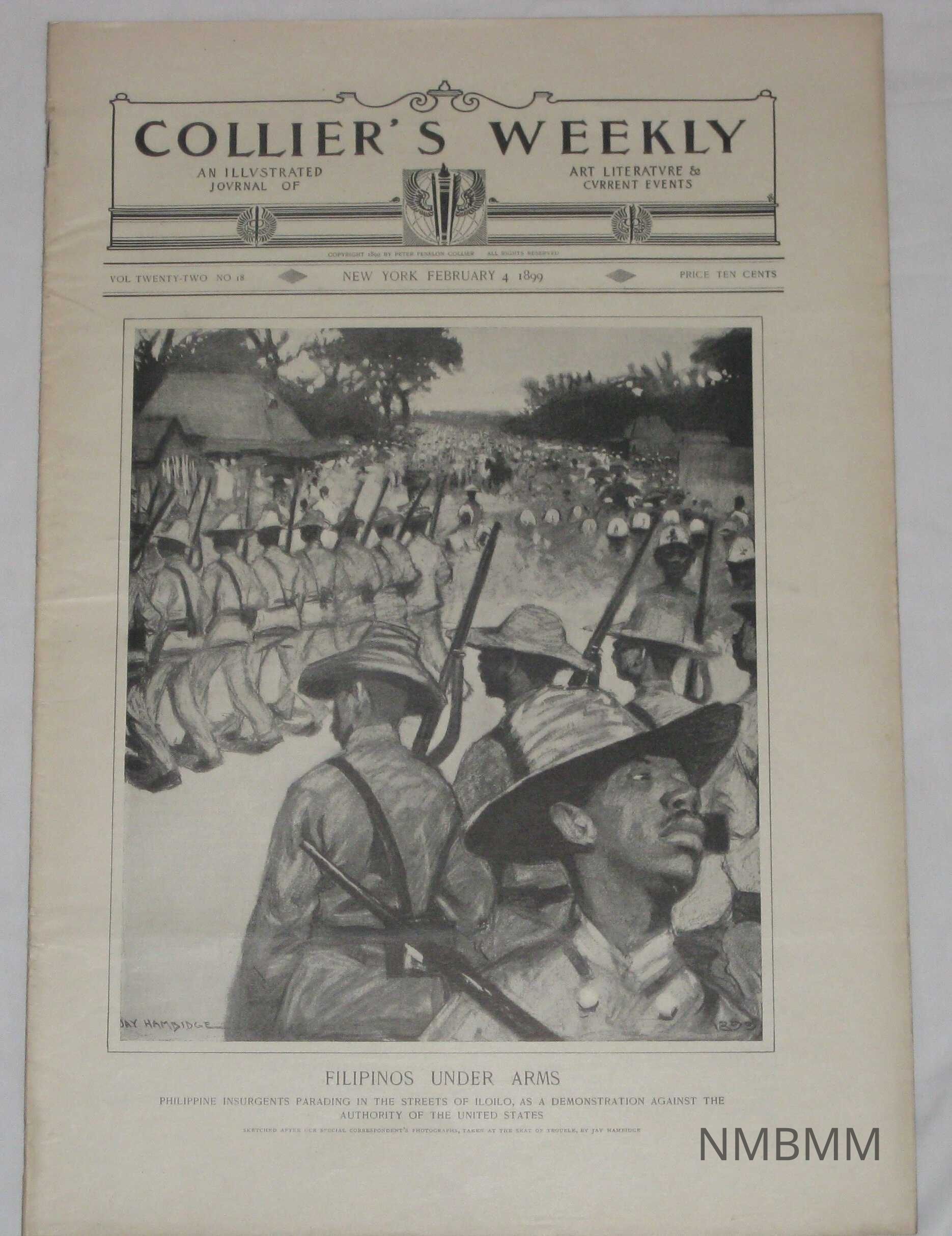 An issue of Collier's Weekly, an illustrated journal of art, literature and current events, Vol. 22 No. 18, published February 4, 1899. The cover features an illustration by Jay Hambidge of Philippine insurgents with the title, "Filipinos Under Arms." The captions reads, "Philippine Insurgents Parading In The Streets Of Iloilo, As A Demonstration Against The Authority Of The United States." The illustration was sketched from a special correspondent's photographs.Collection